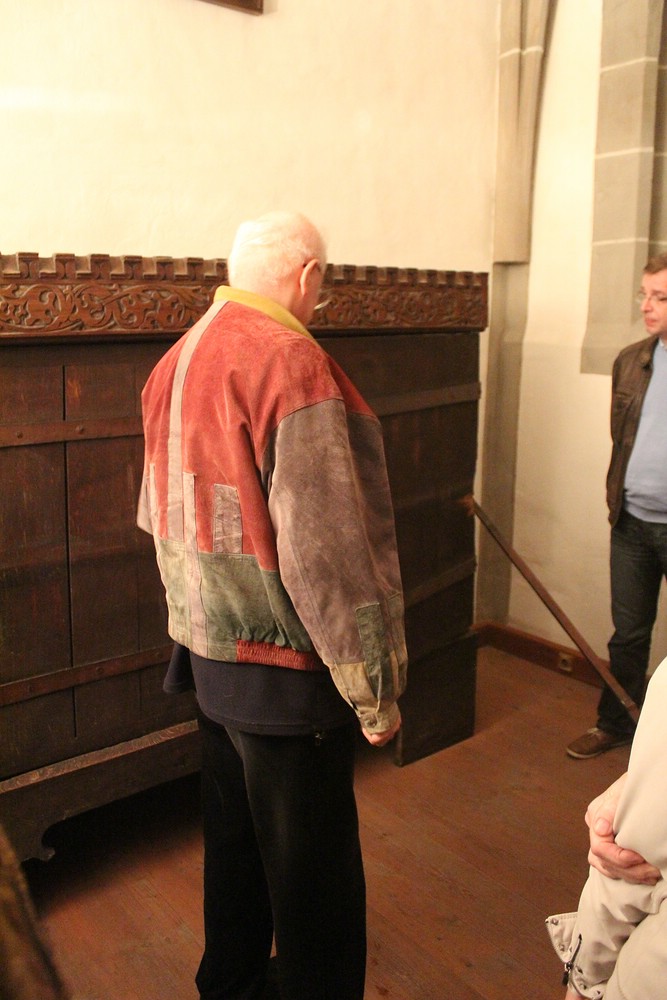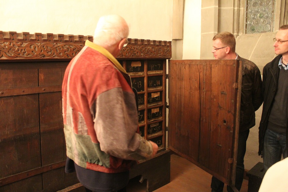 Die sich anschließende Führung durch den Kirchenraum war zugleich eine Zeitreise in die Vergangenheit. Gespannt lauschten alle Besucher den Ausführungen von Dr. Kühn zur Entstehung des Doms, den Zusammenhängen zum örtlichen Bergbau, den Problemen der Standfestigkeit des Bauwerks und den Geschichten um Handwerker, Altar, Gruft und den von Bose´ s und von Römer´s. Nach und nach fühlten wir uns in die jeweilige Zeitepoche zurückversetzt. Für alle überraschend war die Besichtigung des „ 1. Zwickauer Sozialamtes“. Diesen Raum im Dom hatte noch keiner unserer Mitglieder je zuvor besichtigt; umso größer war das Staunen. Spätestens jetzt war die Neugier geweckt und für viele war die Turmbesichtigung (trotz Nebel und Dunkelheit) der wörtlich genommene „Höhepunkt“ des Stammtisches. Die Zeit war wie im Flug vergangen und auf dem Nachhauseweg hingen wir den in den letzten beiden Stunden gewonnenen Eindrücken noch nach.