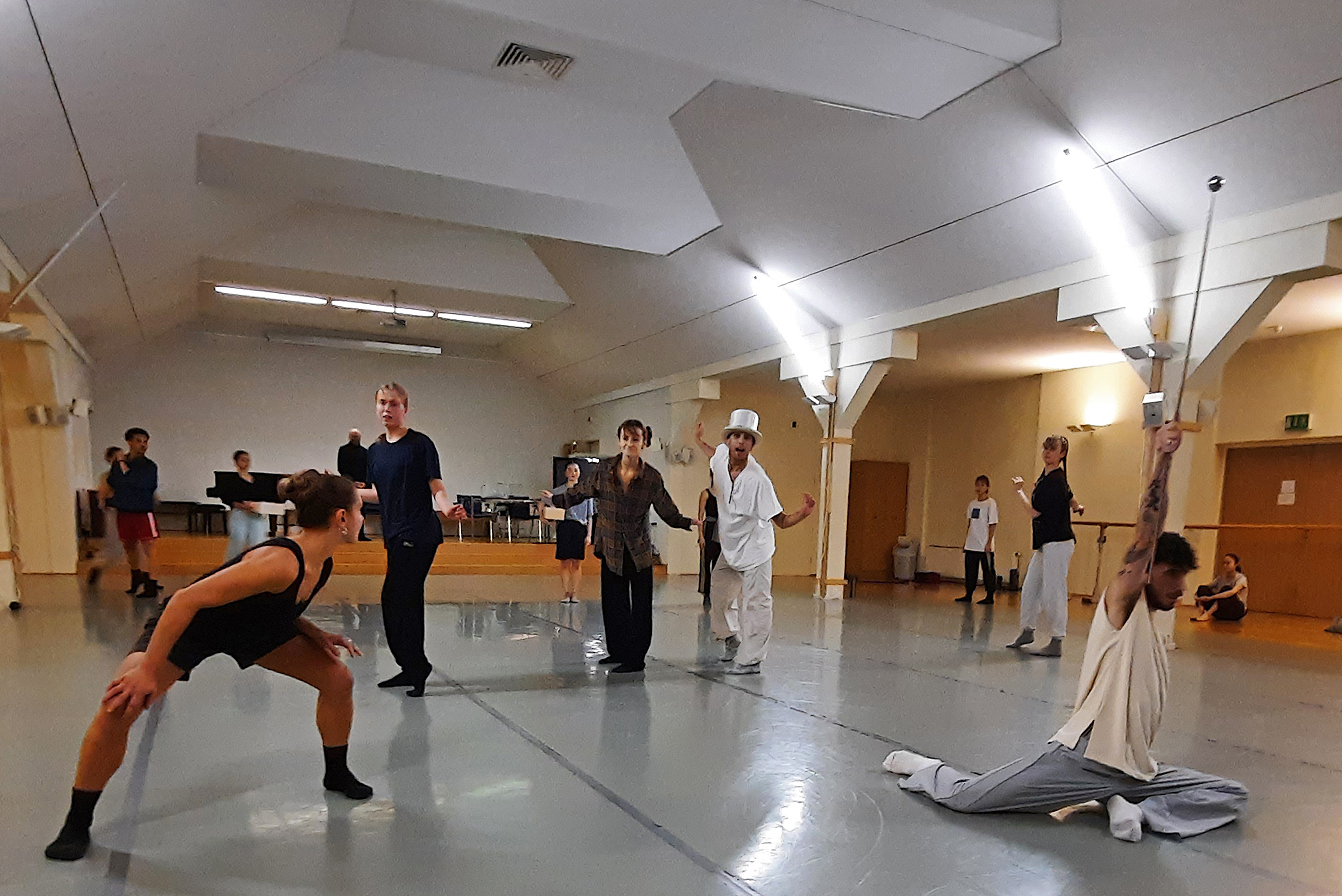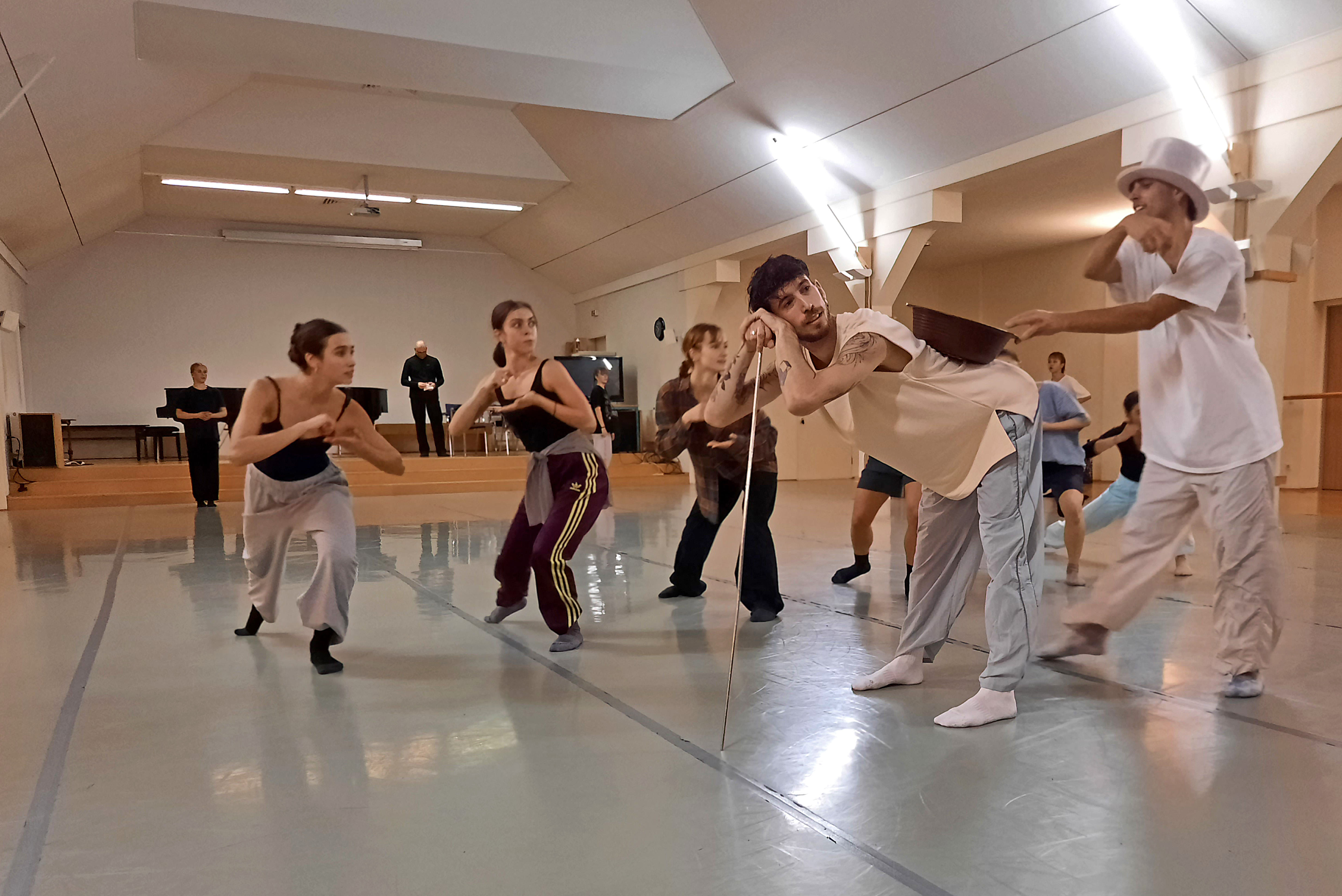 Nach der Begrüßung durch den Ballettdirektor Sergei Vanaev begann das gemeinsame Warm Up. Begleitet vom Ballett-Repetitor Masayuki Carvalho am Flügel machte der Ballettchef konkrete Ansagen, nach denen sich die 11 Tänzerinnen und 6 Tänzer an den Ballettstangen bewegten. Da die Mitglieder der Kompanie aus verschiedenen Ländern kommen, u. a. Japan, China, Korea, Brasilien, Finnland, Italien, wird im Ensemble Englisch gesprochen. Ich weiß nicht, ob mein Englisch nicht ausreichte oder ob die verwendeten Begriffe doch etwas spezifisch sind – ich jedenfalls habe bis auf eine einige französische Einsprengsel, z. B. „Plie“, nichts verstanden. Bei den Tänzerinnen und Tänzern funktionierten die Ansagen, sie bewegten sich zur Musik. Erste Schweißperlen wurden sichtbar und immer mehr Garderobenteile wurden abgelegt.
