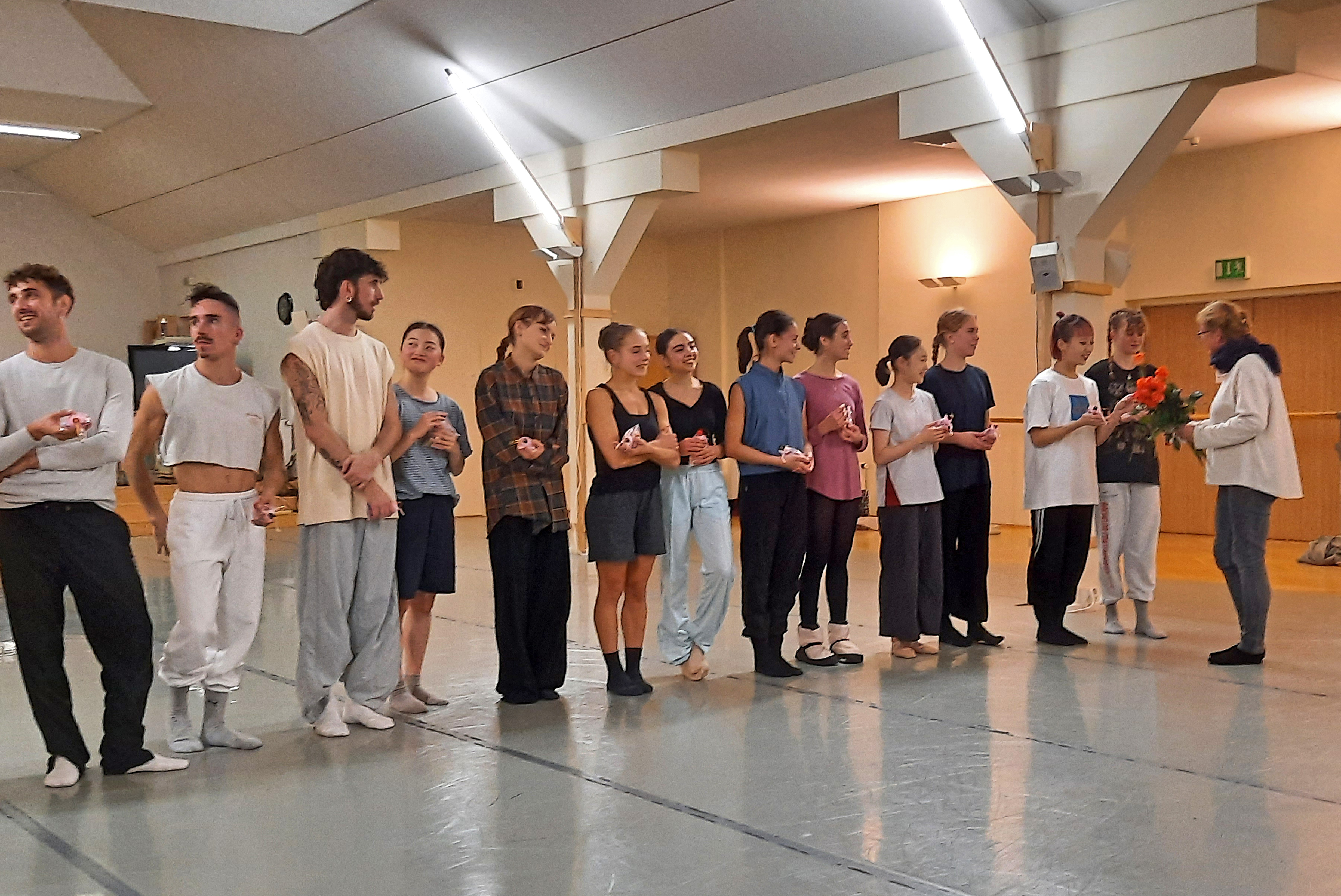 Für uns gab es nun erste Einblicke in Szenen des Balletts. Immer wieder wechselten die Beteiligten. Interessant war, dass Doppelbesetzungen am Rand der „Bühne“ immer mittanzten. Was ich so auch nicht erwartet hätte, war die große Aufmerksamkeit gegenüber den KollegInnen von Seiten der gerade nicht tanzenden Ballett-Mitglieder. Sie sparten nicht mit Beifall, den es auch reichlich von uns Gästen gab.