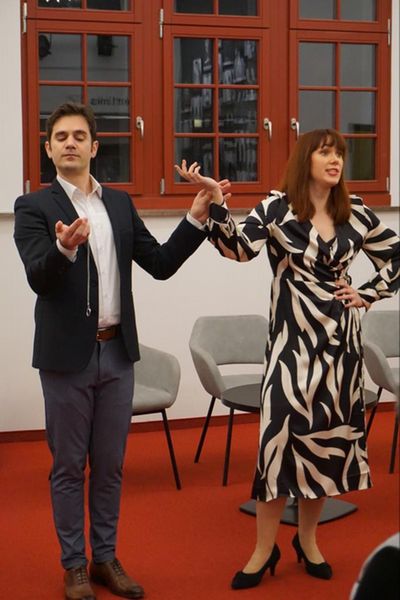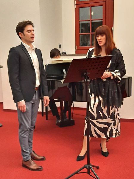 Mit den Sängern Christina Maria und André GAss sowie Jooan Mun am Klavier begrüßte uns gleich eine bunt gemischte internationale Truppe aus Deutschland, Frankreich und Südkorea zu einem vergnüglichen Abend. Extra für uns hatten die Künstler ein Liebesduett (aus Donizettis "Don Pasquale") vorbereitet - und danach, als Gegenstück, das nicht so harmonische "Uhrenduett" aus der "Fledermaus". Ein augenzwinkernder Hinweis auf das Leben des nunmehr seit etwas einem halben Jahr verheirateten Paars Gass?