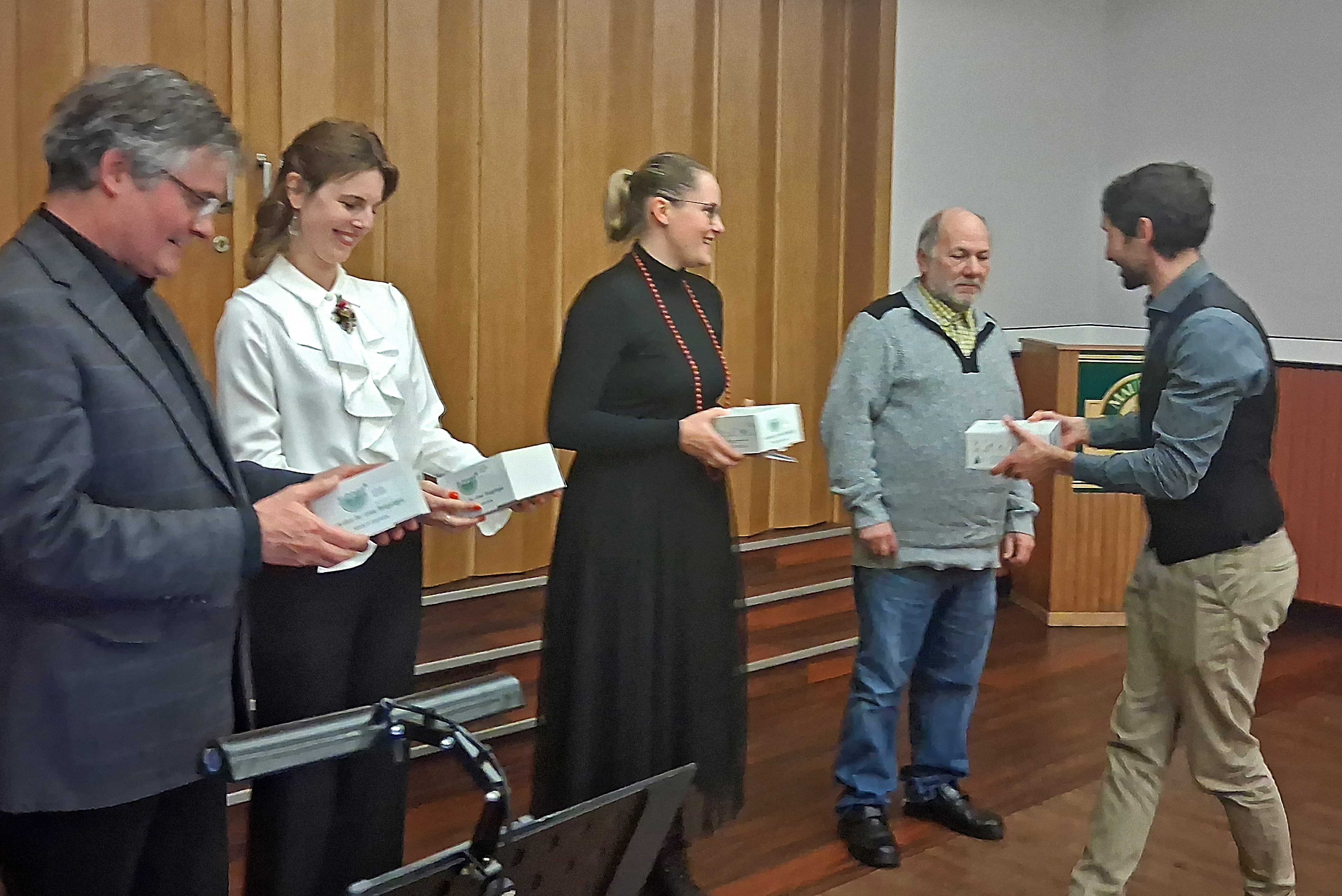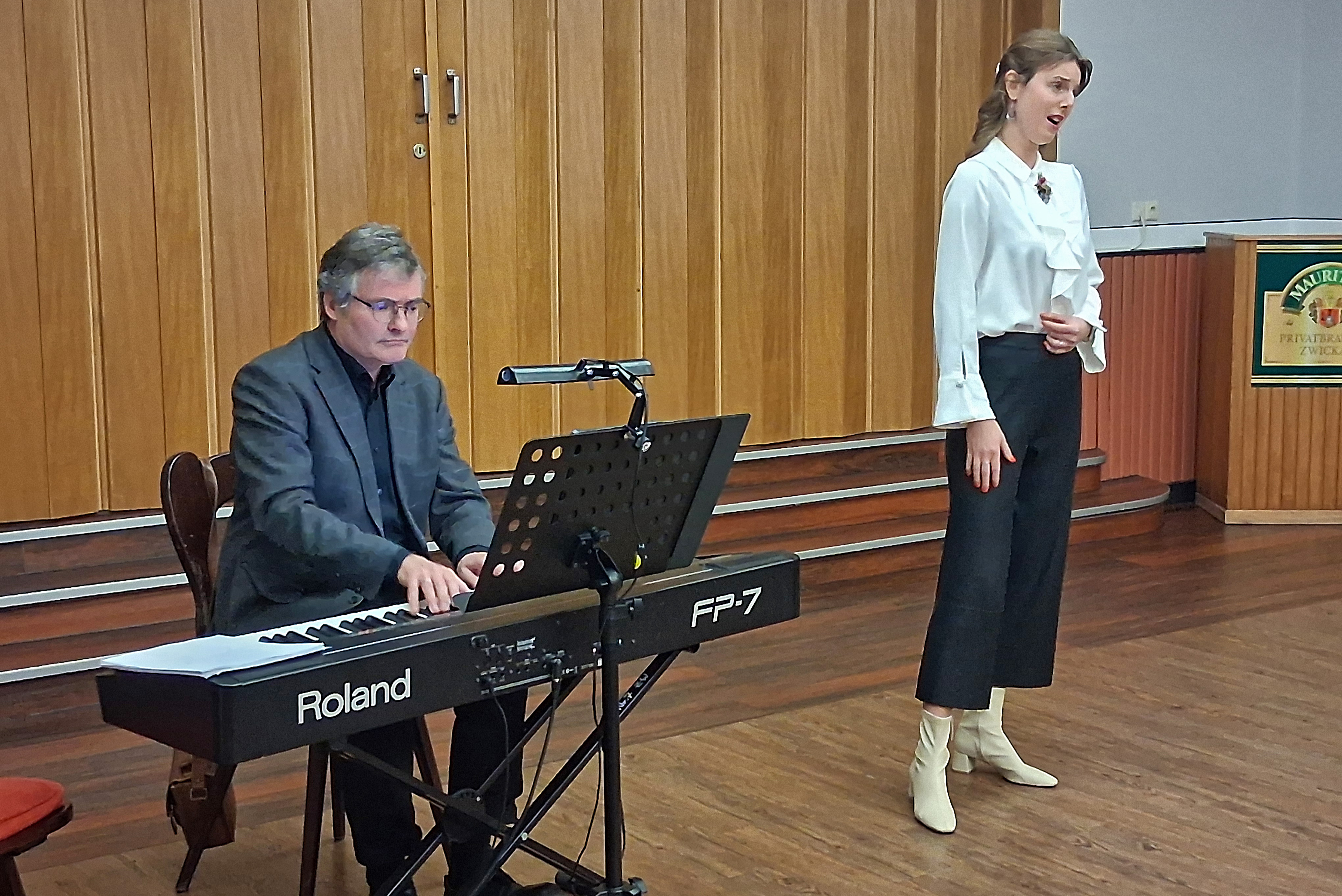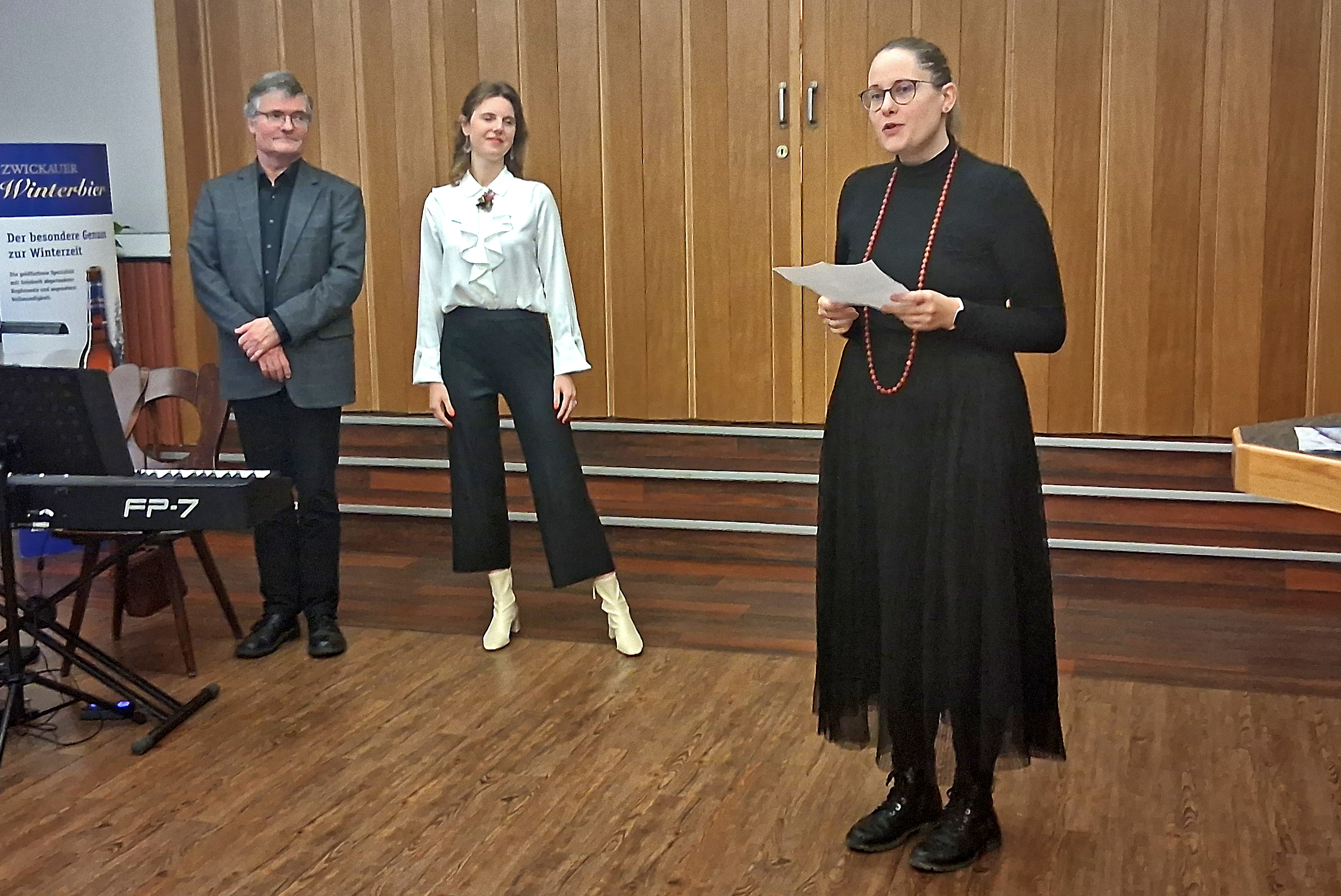 Die Begrüßung unserer Gäste – Anne Sandmann, die junge Mezzosopranistin Joanna Jaworowska und Matthias Spindler – übernahm diesmal Patrick Pühn, der seit diesem Jahr Vorstandsmitglied unseres Fördervereins ist. Für die weihnachtliche Stimmung sorgten verschiedene Lieder und Geschichten, und nebenbei erfuhren wir auch wieder viel Interessantes von den Künstlern. So erzählte uns Joanna „Ascha“ Jaworowska, dass sie über das Erasmus-Programm als Organistin nach Deutschland kam. Aber der direkte Kontakt zum Publikum reizte sie dann doch mehr, und sie studierte Kirchenmusik und Gesang. Ein spannender Werdegang! Als Mezzosopranistin ist sie öfter in Hosenrollen zu sehen, sie genießt diese Möglichkeit, in ganz verschiedene Rollen zu schlüpfen und freut sich besonders auf ihre Rolle in „Hoffmanns Erzählungen“. Dann plauderte sie noch über die Weihnachtsbräuche in Polen, und mit einem polnischen Weihnachtslied endete diese kurzweilige Vorstellung.