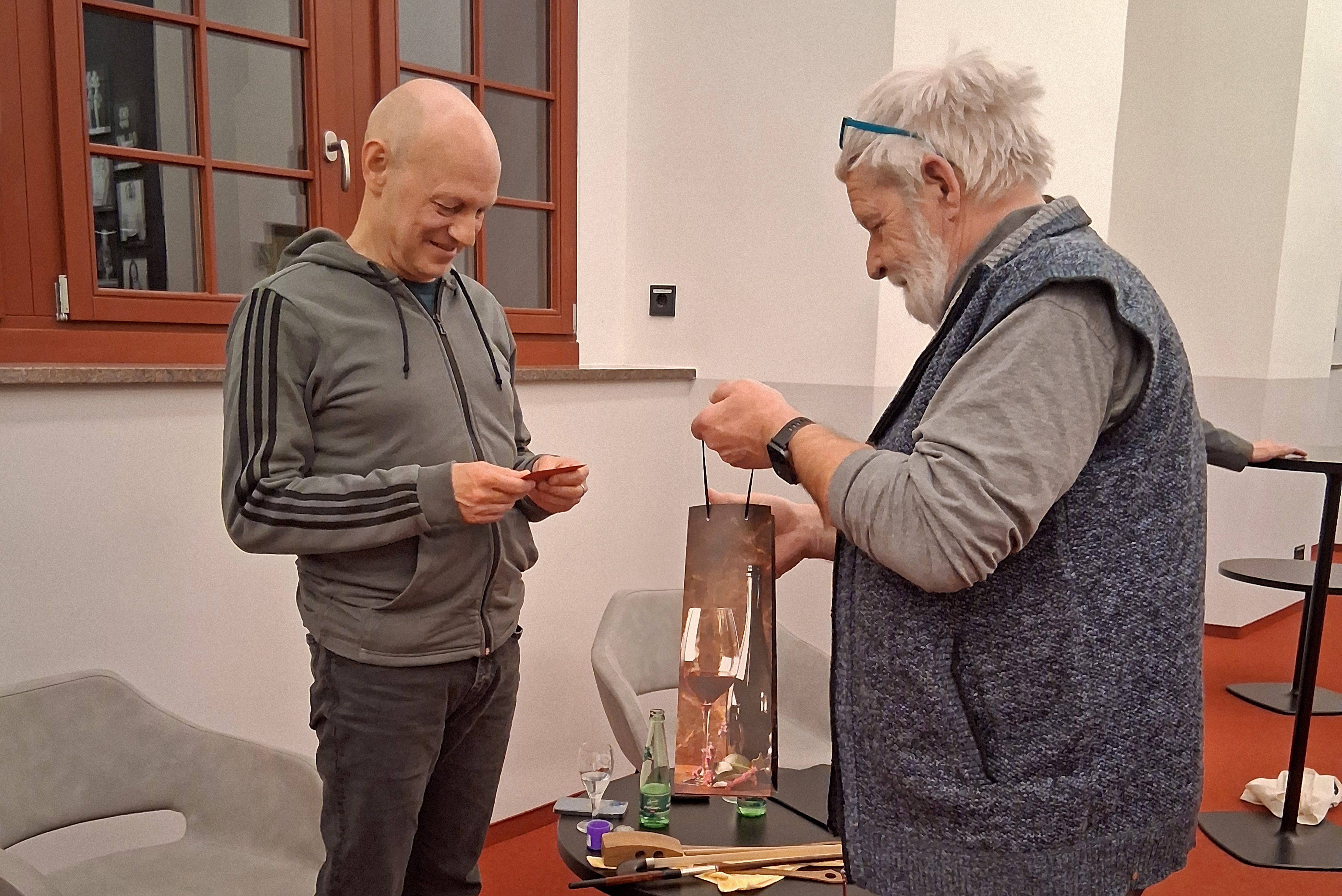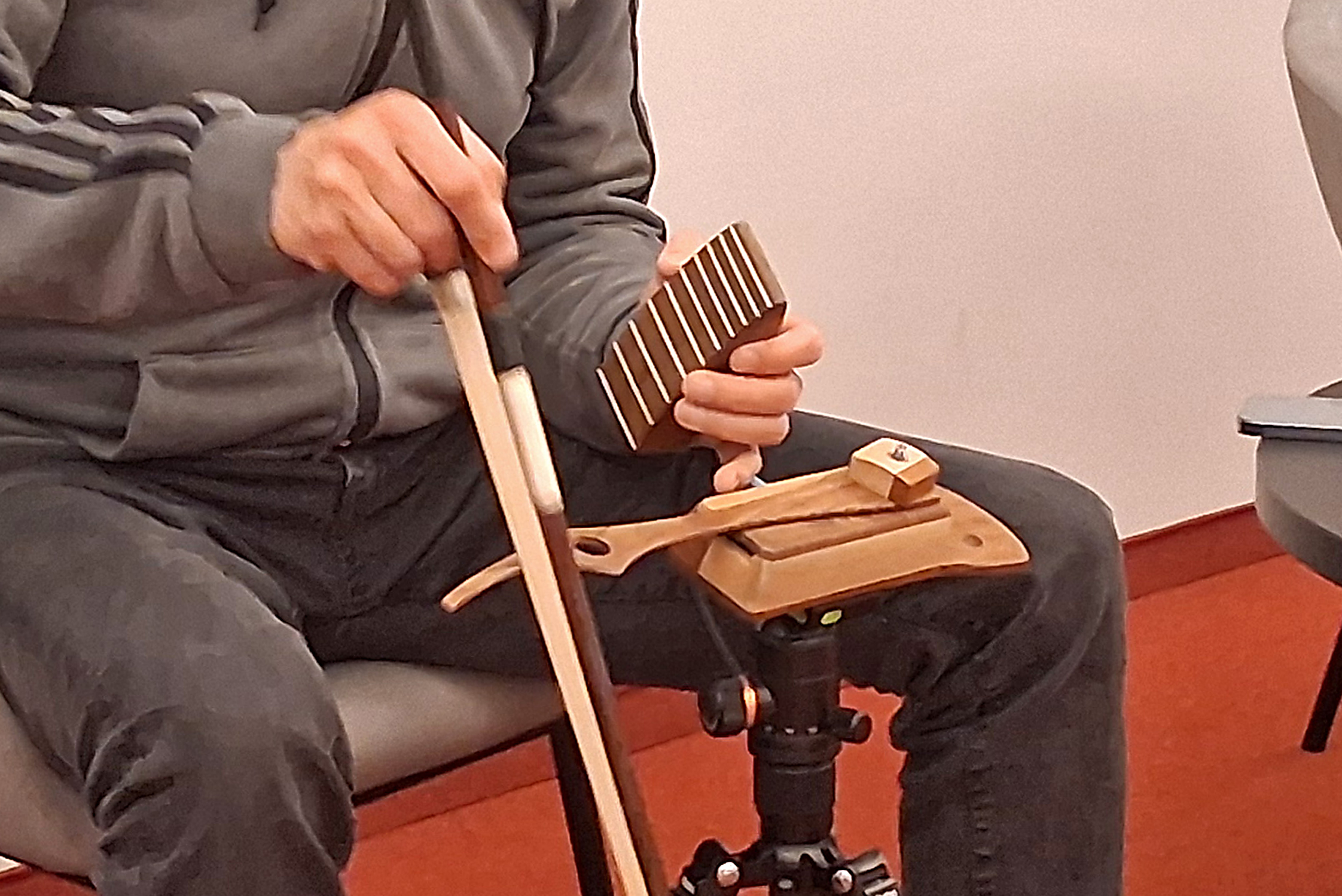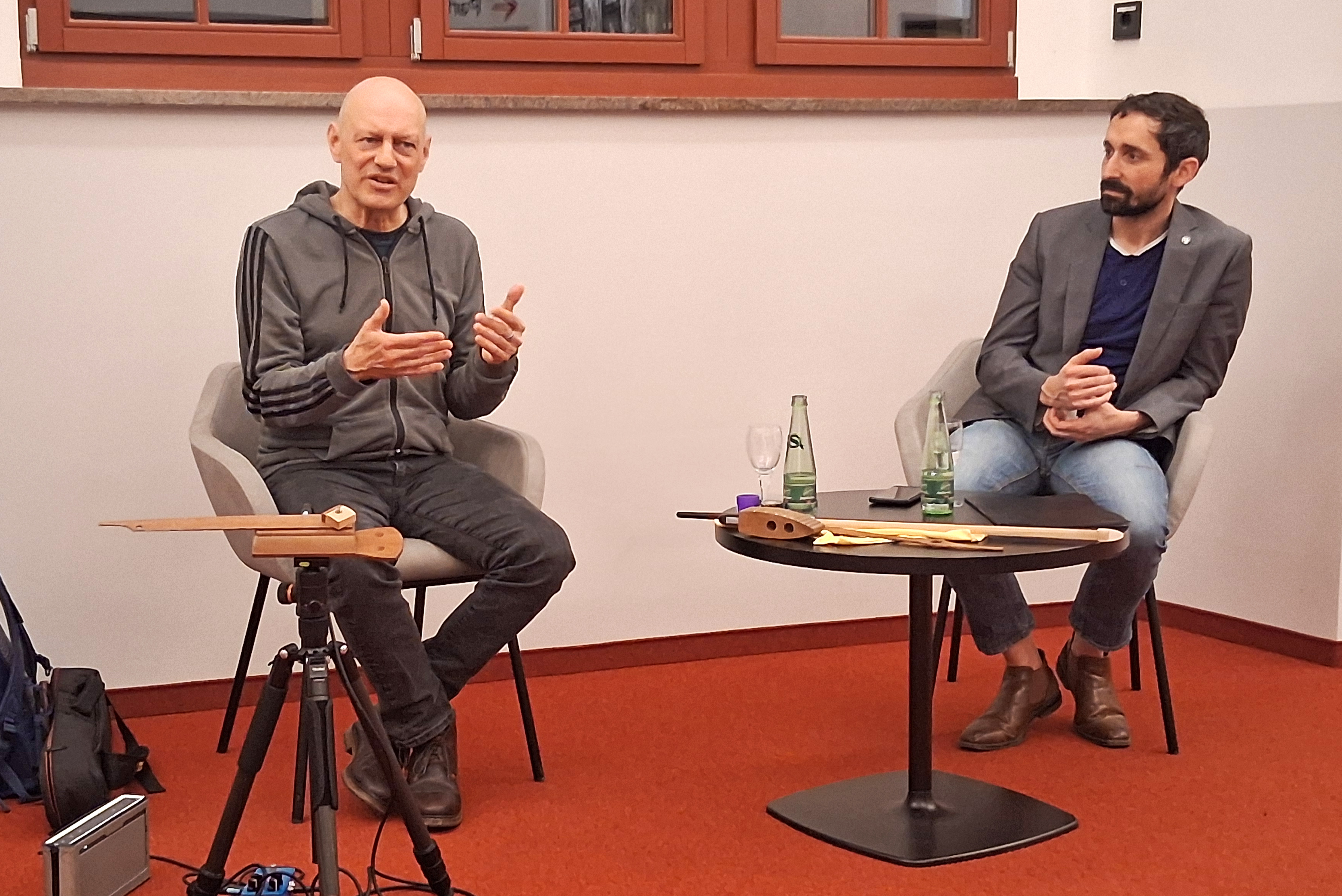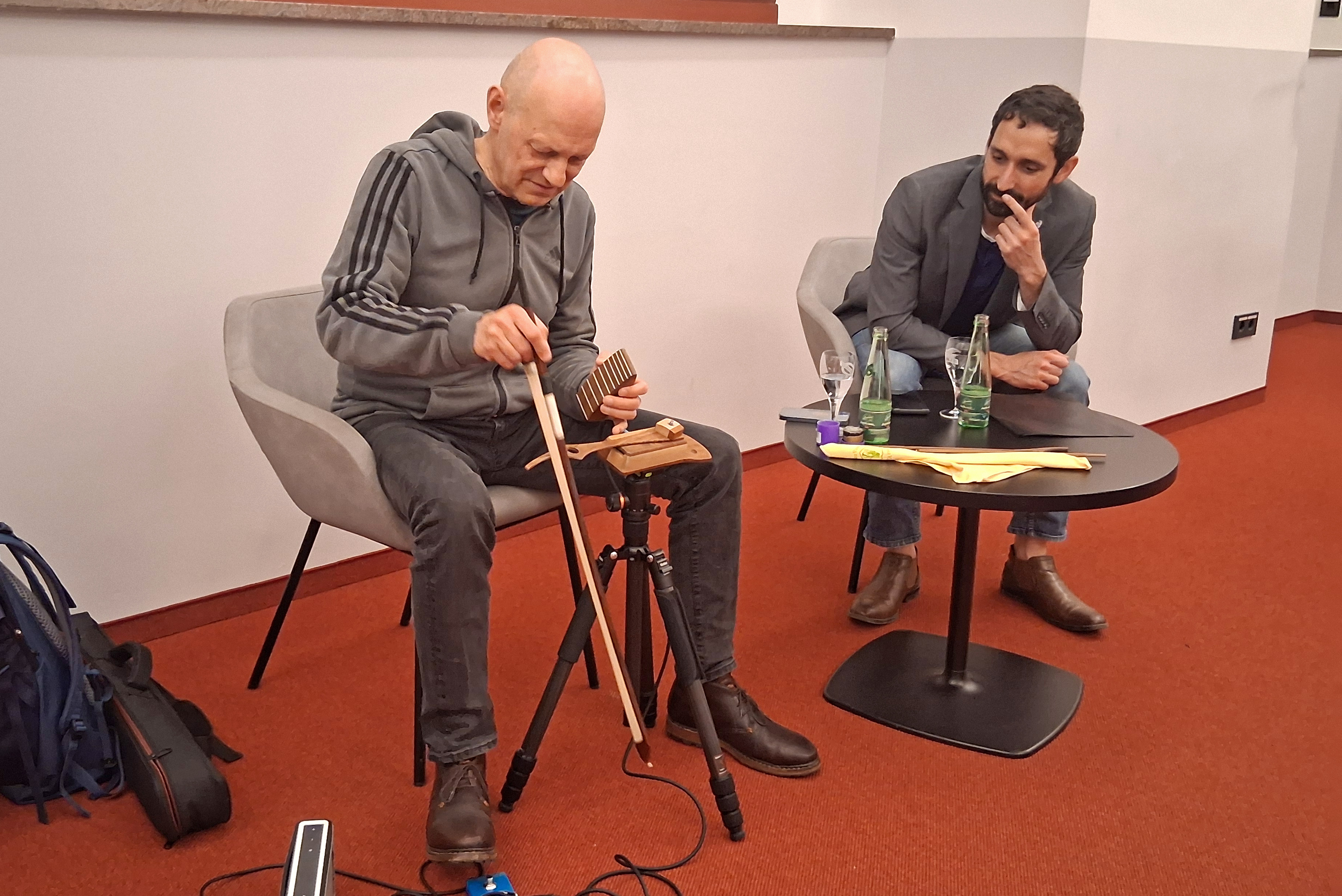 Neben Klavier hat er bereits früh auch Interesse für andere Instrumente gehabt, z. B. Gitarre und Querflöte. Und er ist ständig auf der Suche nach neuen Instrumenten, um Personen und Handlungen auf der Bühne möglichst individuell zeichnen zu können. Bei der Suche nach Musik für „Richard III“ stieß er auf das von dem Wuppertaler Gitarristen Hans Reichel erfundene Daxophon – dem er ganz spannende, surreale Töne entlockt. Gespannt lauschten wir auf die vielen unterschiedlichen Facetten dieses Instruments, bei dem eine Holzzunge zum Schwingen gebracht wird.