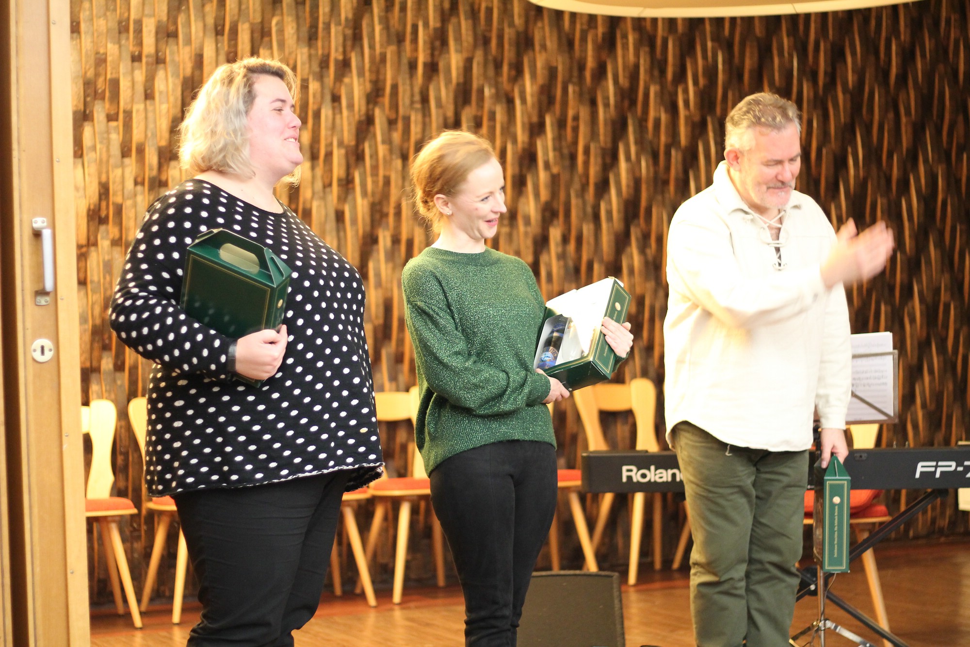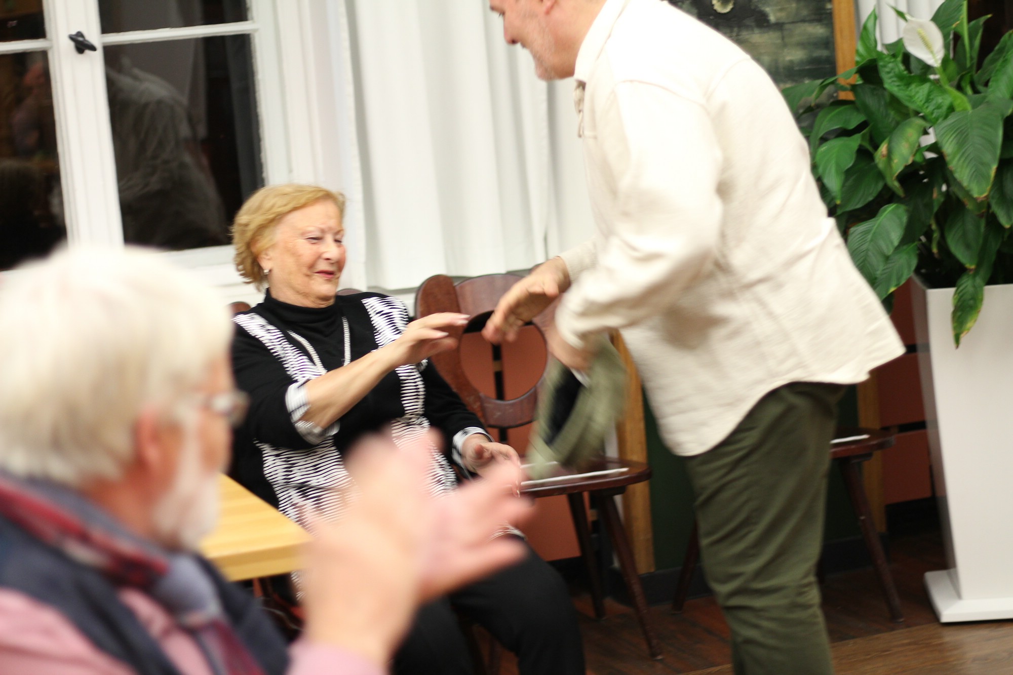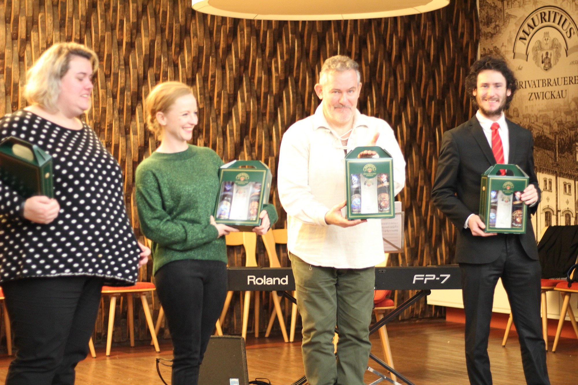Trotz Regenguss abends am 3. Dezember 2018, konnte man die Weihnachtsstimmung im Schalander der Mauritiusbrauerei spüren. Der Raum war weihnachtlich geschmückt und wer eine gute Nase hatte, konnte den Duft von Räucherkerzchen wahrnehmen. Unser Vorsitzender, Henry Klüglich, begrüßte die zahlreich erschienenen Gäste recht herzlich. Und, wie schon zu einer guten Tradition geworden, stimmten Künstler unseres Theaters musikalisch auf die Adventszeit ein. Maxi Ratzkowski, künstlerische Produktionsleiterin und leitende Dramaturgin Schauspeil am Theater, führte durch das Programm. Vom Milchmann aus “Anatevka“, gesungen von Frank Blees (Sänger, seit dieser Spielzeit im Ensemble), erfuhren wir, was er alles machen würde, wenn er einmal reich wäre. Spontan bekam der „arme Mann“ von einer Zuschauerin eine Kopfbedeckung. Schauspielerin Julia Hell schwärmte von ihrem himmelblauen Trabant, eine Kostprobe aus „Horch was kommt von Draußen rein“. Zum Abschluss konnten wir alle von einer weißen Weihnacht träumen. Vielleicht erfüllt sich der Traum. Musikalisch wurden die beiden Künstler von Mark Johnston, Solorepetitor und Dirigent, am E-Piano begleitet. Mit viel Applaus und einem kleinen Dankeschön wurden die Künstler verabschiedet. Ein Dankeschön ging stellvertretend auch an Horst Grunwald von der (Ton)Technik. Anschließend lud Henry Klüglich an das kalte Buffet. Danach war genügen Zeit, um Gespräche zu führen und um den Theaterliebling zu wählen.