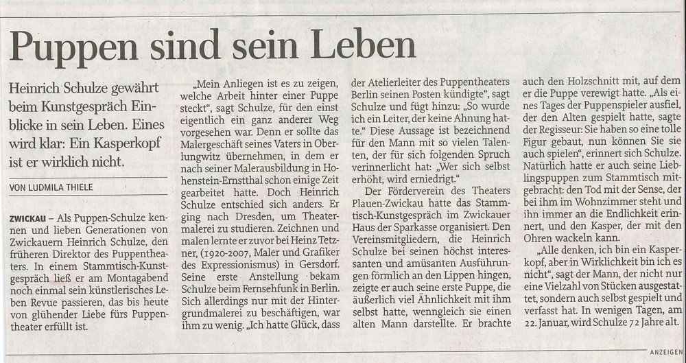 Unser Förderverein nahm am Montag, den 09.01.2017, wieder am Stammtisch Platz – diesmal zu einem Kunstgespräch mit Heinrich „Puppen-Schulze“. Los ging es 19.00 Uhr im Haus der Sparkasse Zwickau. Treffpunkt war am roten „S“ … und alle unsere Mitglieder waren sehr pünktlich.