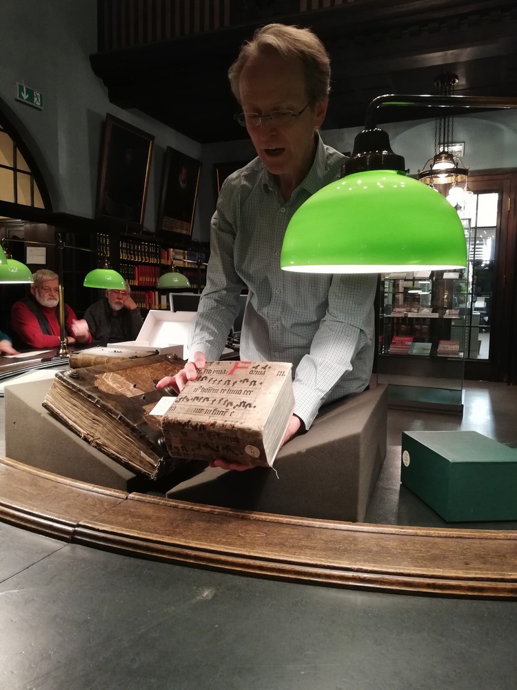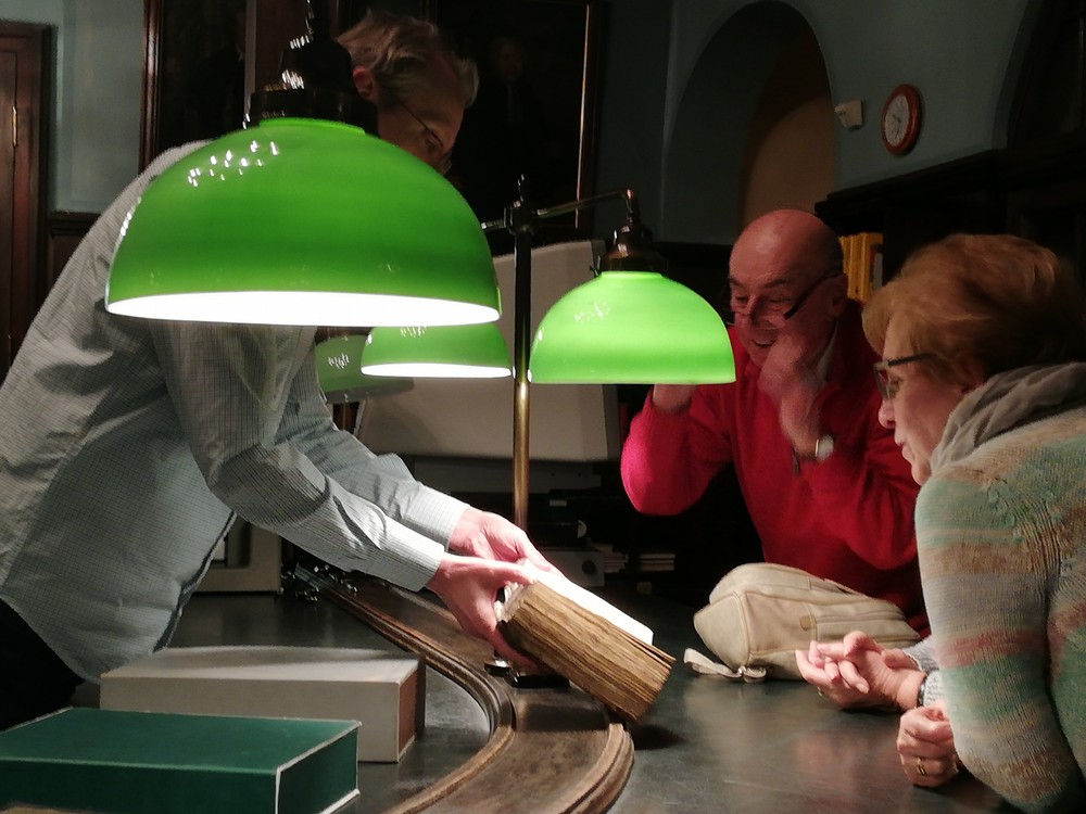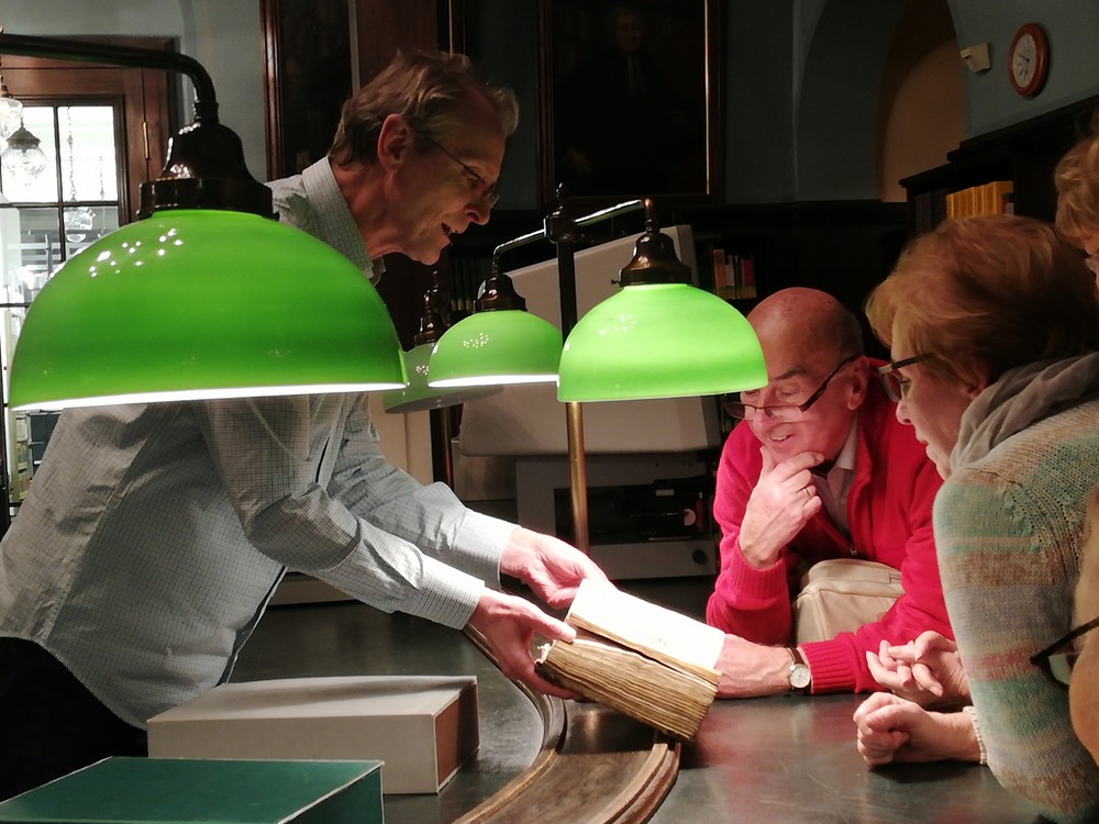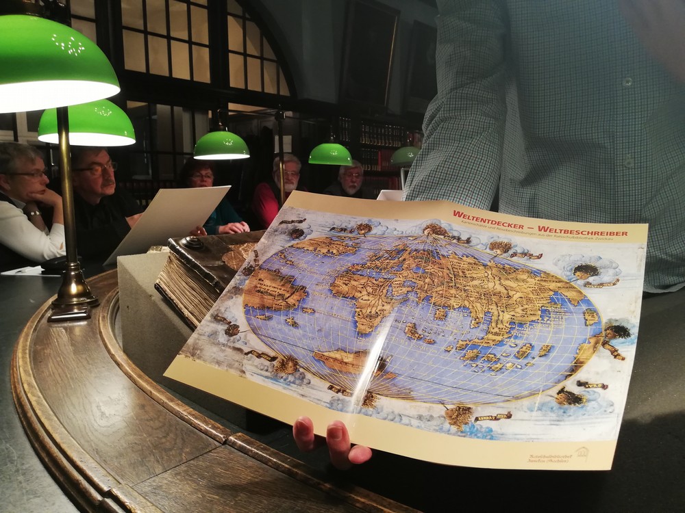Der Leiter der Bibliothek, Dr. Lutz Mahnke, brachte uns seine Liebe zu den alten Büchern und den Geschichten dahinter auf seine kluge und unterhaltsame Art näher, die wohl jeden mitreißt. Stolz präsentierte er uns einen Teil der wertvollen Sammlung von alten Handschriften und Inkunabeln, die in der Schatzkammer der Bibliothek verwahrt werden, zu der uns aber leider der Zutritt verwehrt blieb. Die älteste Handschrift stammt von 830 aus dem Kloster in Lorch, es gibt hier das älteste Mathematikbuch in Deutschland, gedruckt 1483, die älteste Karte von Zwickau, eine Weltkarte von 1508 ... Zu jedem der Stücke hatte Dr. Mahnke eine Geschichte parat und die zwei Stunden vergingen wie im Flug.