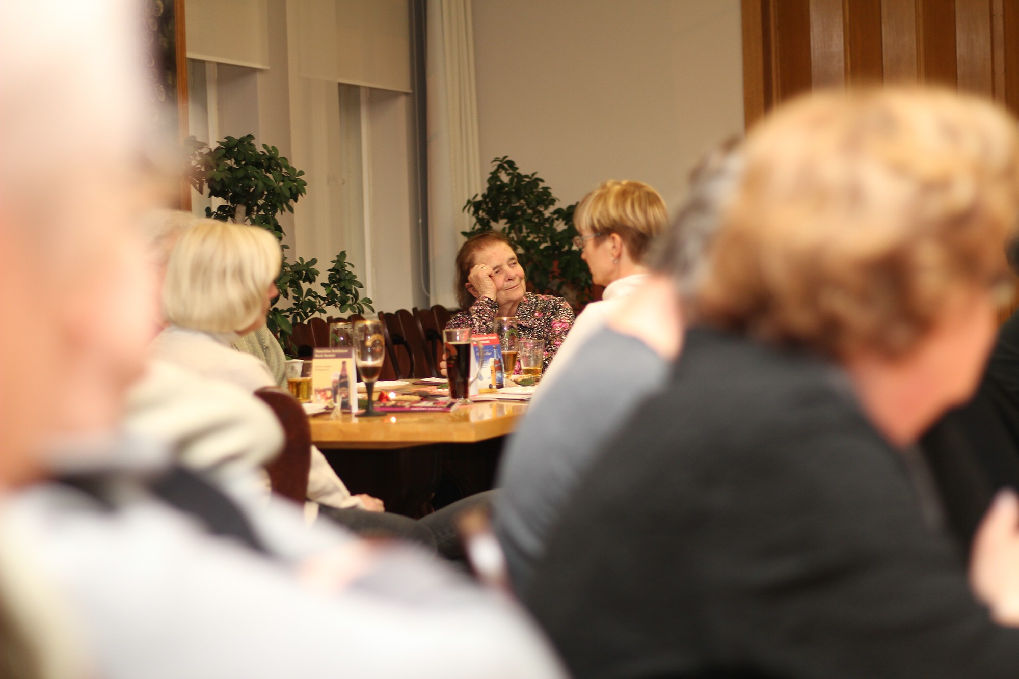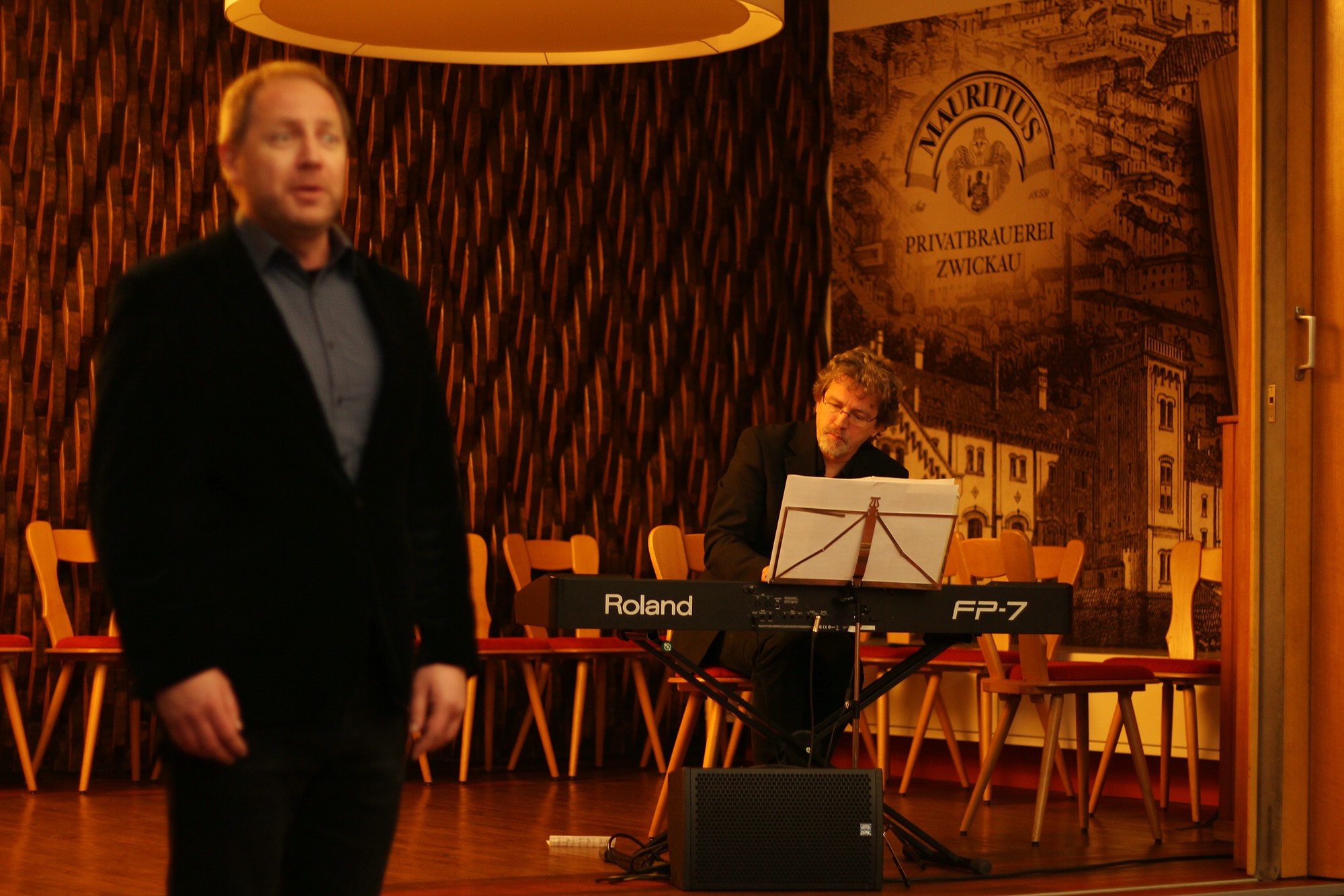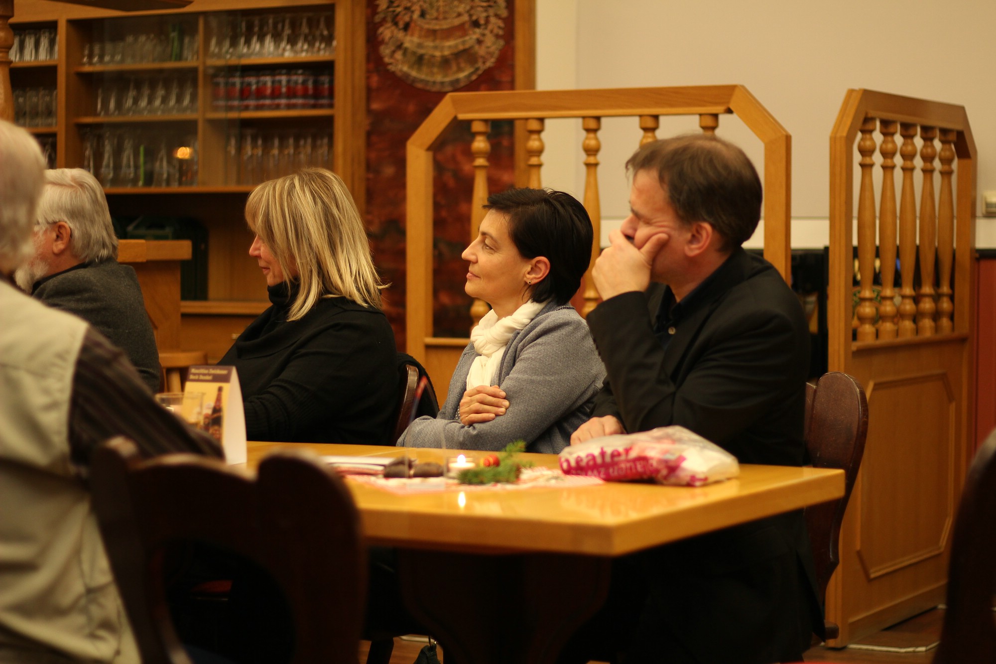 Pünktlich am Vorabend des 04.12.2017 begann es auch noch zu schneien. Die weiße Pracht blieb zwar nicht liegen, trotzdem konnte man die Weihnachtsstimmung spüren. Am Abend des 04.12.2017, um 19:00, Uhr trafen ca. 30 Gäste im Schalander der Mauritiusbrauerei in Zwickau ein. Der Raum war weihnachtlich geschmückt und wenn man eine gute Nase hatte, konnte man den Duft von Räucherkerzchen wahrnehmen. Unser Vorsitzender, Henry Klüglich, begrüßte alle recht herzlich. Und, wie schon zu einer guten Tradition geworden, stimmten uns Künstler unseres Theaters musikalisch auf die Adventszeit ein. Mit den Wünschen auf eine weiße Weihnacht, gemeinsam gesungen von Nataliia Ulasevych und Karsten Schröter, unter musikalische Begleitung von Martin Eckenweber, ging das musikalische Intermezzo zu Ende. Mit viel Applaus und einem kleinen Dankeschön wurden die Künstler verabschiedet. Anschließend lud uns Henry Klüglich an das kalte Buffet ein. Danach war genügen Zeit, um Gespräche zu führen, auch mit Andre‘ Meyer, unserem neuen leitenden Dramaturgen für Musiktheater, Konzert und Ballett. In diesem Jahr war es auch einmal der Leiterin vom Besucherservice, Claudia Kuntze, zeitlich möglich, unseren Stammtisch zu besuchen. Frau Kuntze ist unser „fleißiges Bienchen“, wenn es an die Kuvertierung und Versendung der Einladungen zu den Stammtischen und anderen Veranstaltungen geht. So haben wir ihre Anwesenheit genutzt, um uns bei ihr einmal ganz herzlich für die große Hilfe zu bedanken. Das kam für sie völlig überraschend, umso größer war ihr die Freude anzumerken.