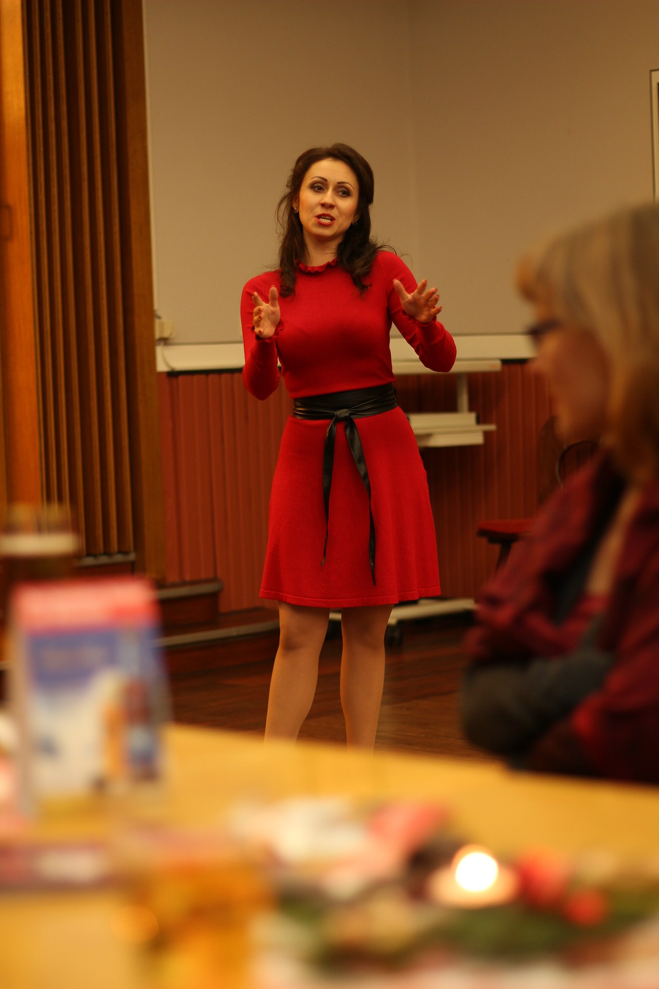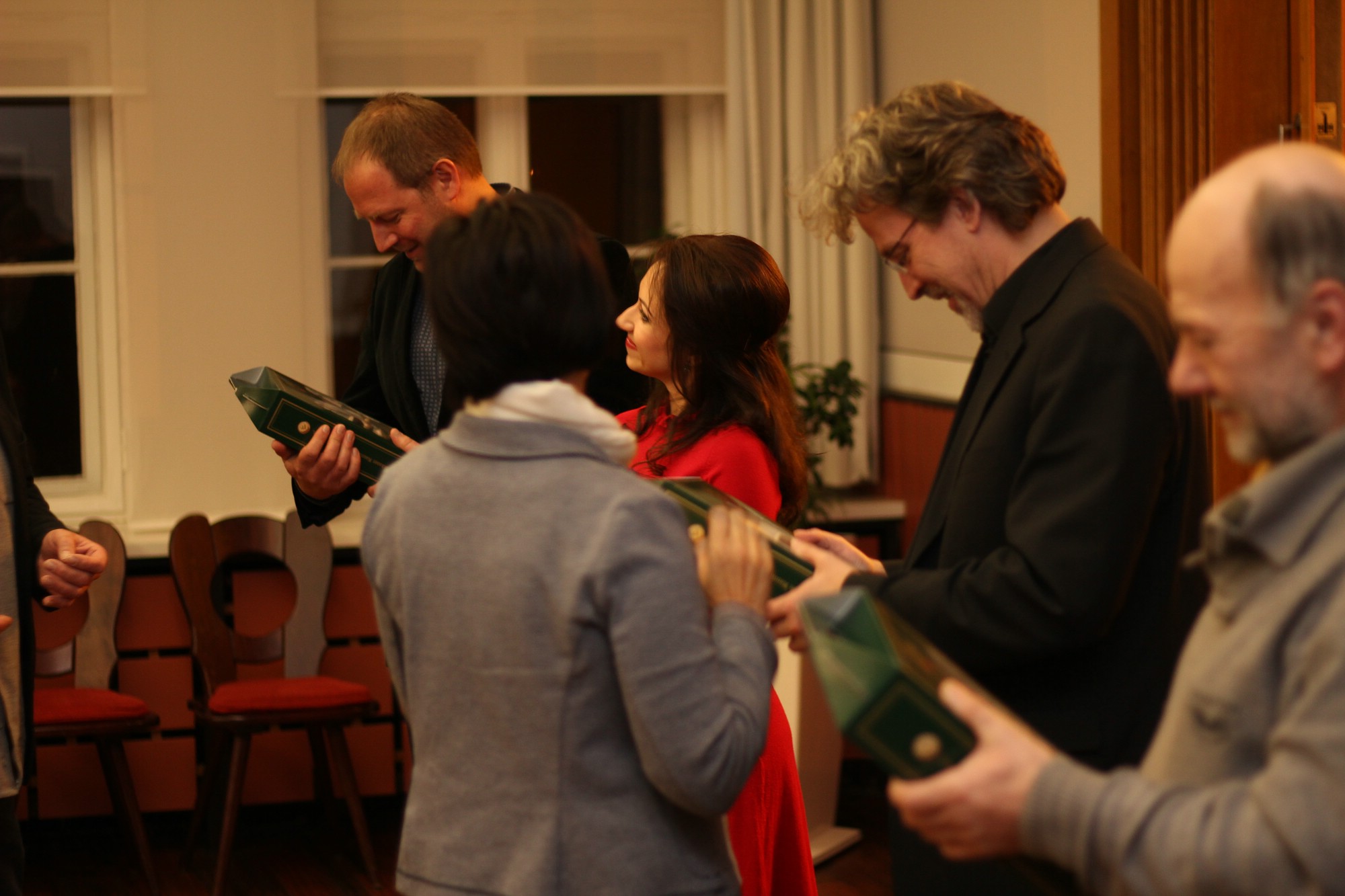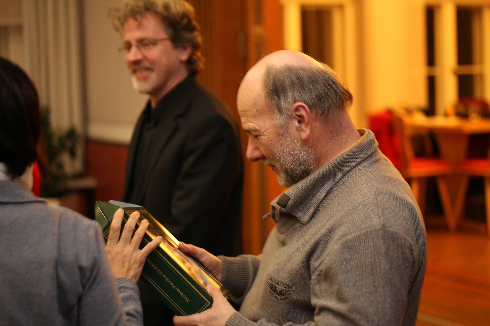 Pünktlich am Vorabend des 04.12.2017 begann es auch noch zu schneien. Die weiße Pracht blieb zwar nicht liegen, trotzdem konnte man die Weihnachtsstimmung spüren. Am Abend des 04.12.2017, um 19:00, Uhr trafen ca. 30 Gäste im Schalander der Mauritiusbrauerei in Zwickau ein. Der Raum war weihnachtlich geschmückt und wenn man eine gute Nase hatte, konnte man den Duft von Räucherkerzchen wahrnehmen. Unser Vorsitzender, Henry Klüglich, begrüßte alle recht herzlich. Und, wie schon zu einer guten Tradition geworden, stimmten uns Künstler unseres Theaters musikalisch auf die Adventszeit ein. Mit den Wünschen auf eine weiße Weihnacht, gemeinsam gesungen von Nataliia Ulasevych und Karsten Schröter, unter musikalische Begleitung von Martin Eckenweber, ging das musikalische Intermezzo zu Ende. Mit viel Applaus und einem kleinen Dankeschön wurden die Künstler verabschiedet. Anschließend lud uns Henry Klüglich an das kalte Buffet ein. Danach war genügen Zeit, um Gespräche zu führen, auch mit Andre‘ Meyer, unserem neuen leitenden Dramaturgen für Musiktheater, Konzert und Ballett. In diesem Jahr war es auch einmal der Leiterin vom Besucherservice, Claudia Kuntze, zeitlich möglich, unseren Stammtisch zu besuchen. Frau Kuntze ist unser „fleißiges Bienchen“, wenn es an die Kuvertierung und Versendung der Einladungen zu den Stammtischen und anderen Veranstaltungen geht. So haben wir ihre Anwesenheit genutzt, um uns bei ihr einmal ganz herzlich für die große Hilfe zu bedanken. Das kam für sie völlig überraschend, umso größer war ihr die Freude anzumerken.