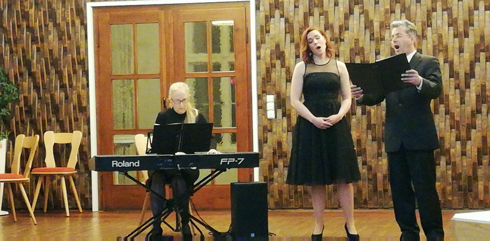 Ein erster Gänsebratenduft erfüllte den Raum, Marcus Sandmann besang eine Weihnachtsgans. Danach konnten wir eine kleine Vorpremiere genießen, Christina Maria Heuel sang das Lied der Mary aus dem Weihnachtsmärchen „Abenteuer im Spielzeugland“, das am 07.12.2019 Premiere in Zwickau hat. Mit dem gemeinsamen Duett „Chants de Noel“(ein Weihnachtslied) verabschiedeten sich die Künstler unter nicht endend wollenden Applaus. Musikalische Begleitung übernahm Kathryn Bolitho. Mit einem kleinen Dankeschön bedankten wir uns. Danach wurde das kalte Buffet eröffnet. Der Einladung zum Buffet und zum Gespräch kamen auch die Künstler gern nach. Das hat alle sehr gefreut.