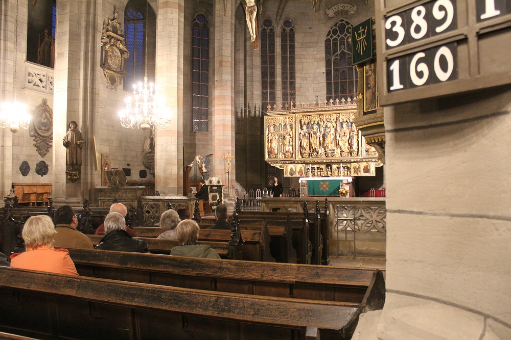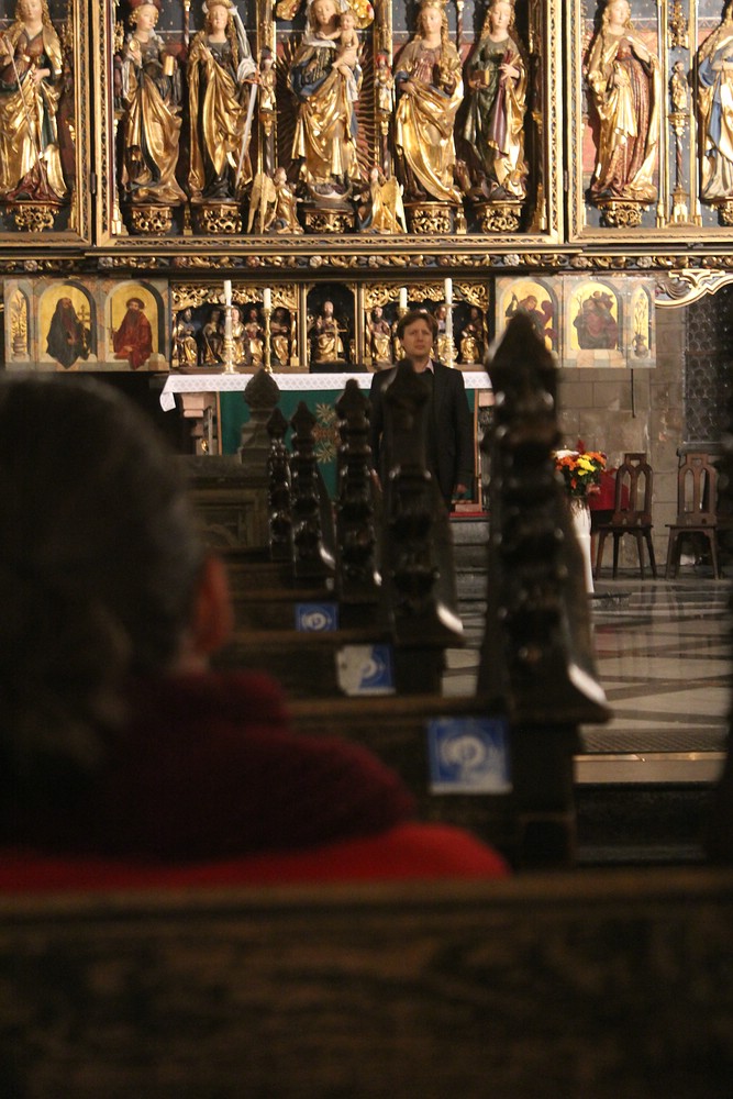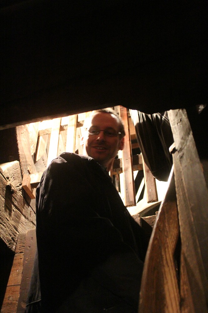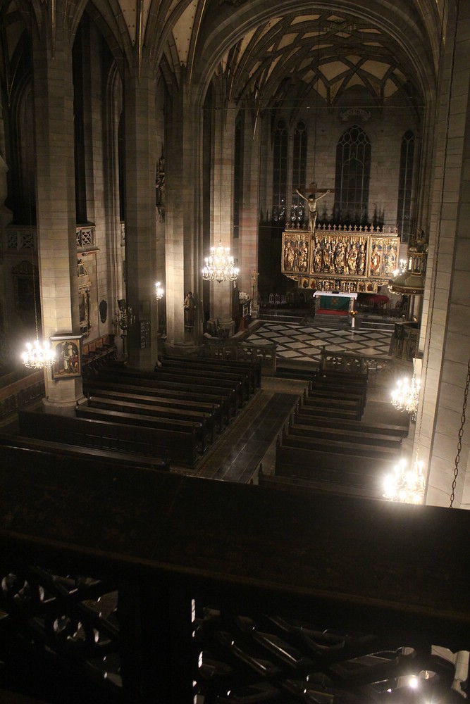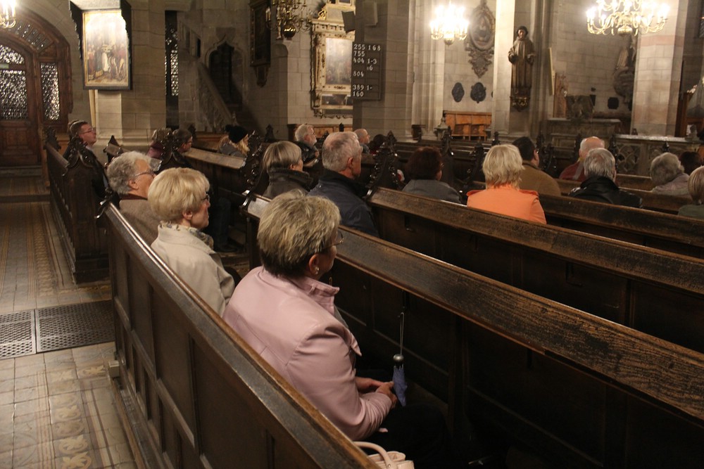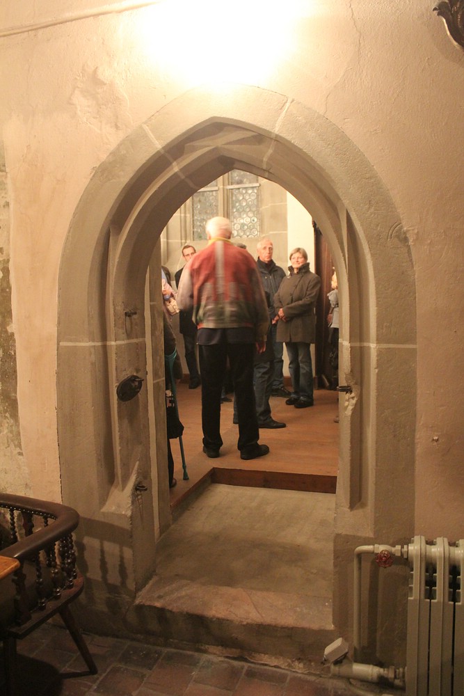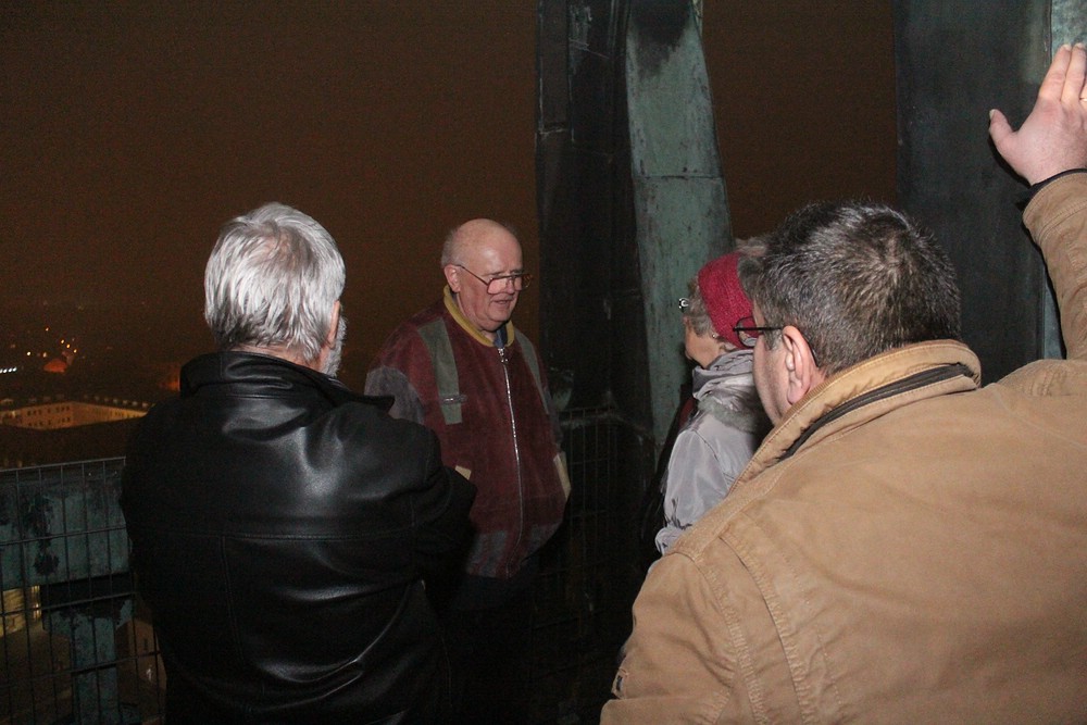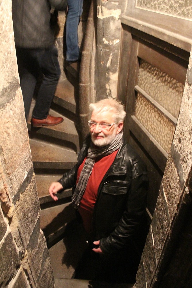 Die sich anschließende Führung durch den Kirchenraum war zugleich eine Zeitreise in die Vergangenheit. Gespannt lauschten alle Besucher den Ausführungen von Dr. Kühn zur Entstehung des Doms, den Zusammenhängen zum örtlichen Bergbau, den Problemen der Standfestigkeit des Bauwerks und den Geschichten um Handwerker, Altar, Gruft und den von Bose´ s und von Römer´s. Nach und nach fühlten wir uns in die jeweilige Zeitepoche zurückversetzt. Für alle überraschend war die Besichtigung des „ 1. Zwickauer Sozialamtes“. Diesen Raum im Dom hatte noch keiner unserer Mitglieder je zuvor besichtigt; umso größer war das Staunen. Spätestens jetzt war die Neugier geweckt und für viele war die Turmbesichtigung (trotz Nebel und Dunkelheit) der wörtlich genommene „Höhepunkt“ des Stammtisches. Die Zeit war wie im Flug vergangen und auf dem Nachhauseweg hingen wir den in den letzten beiden Stunden gewonnenen Eindrücken noch nach.