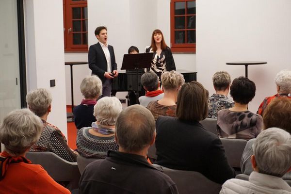 Mit den Sängern Christina Maria und André GAss sowie Jooan Mun am Klavier begrüßte uns gleich eine bunt gemischte internationale Truppe aus Deutschland, Frankreich und Südkorea zu einem vergnüglichen Abend. Extra für uns hatten die Künstler ein Liebesduett (aus Donizettis "Don Pasquale") vorbereitet - und danach, als Gegenstück, das nicht so harmonische "Uhrenduett" aus der "Fledermaus". Ein augenzwinkernder Hinweis auf das Leben des nunmehr seit etwas einem halben Jahr verheirateten Paars Gass?