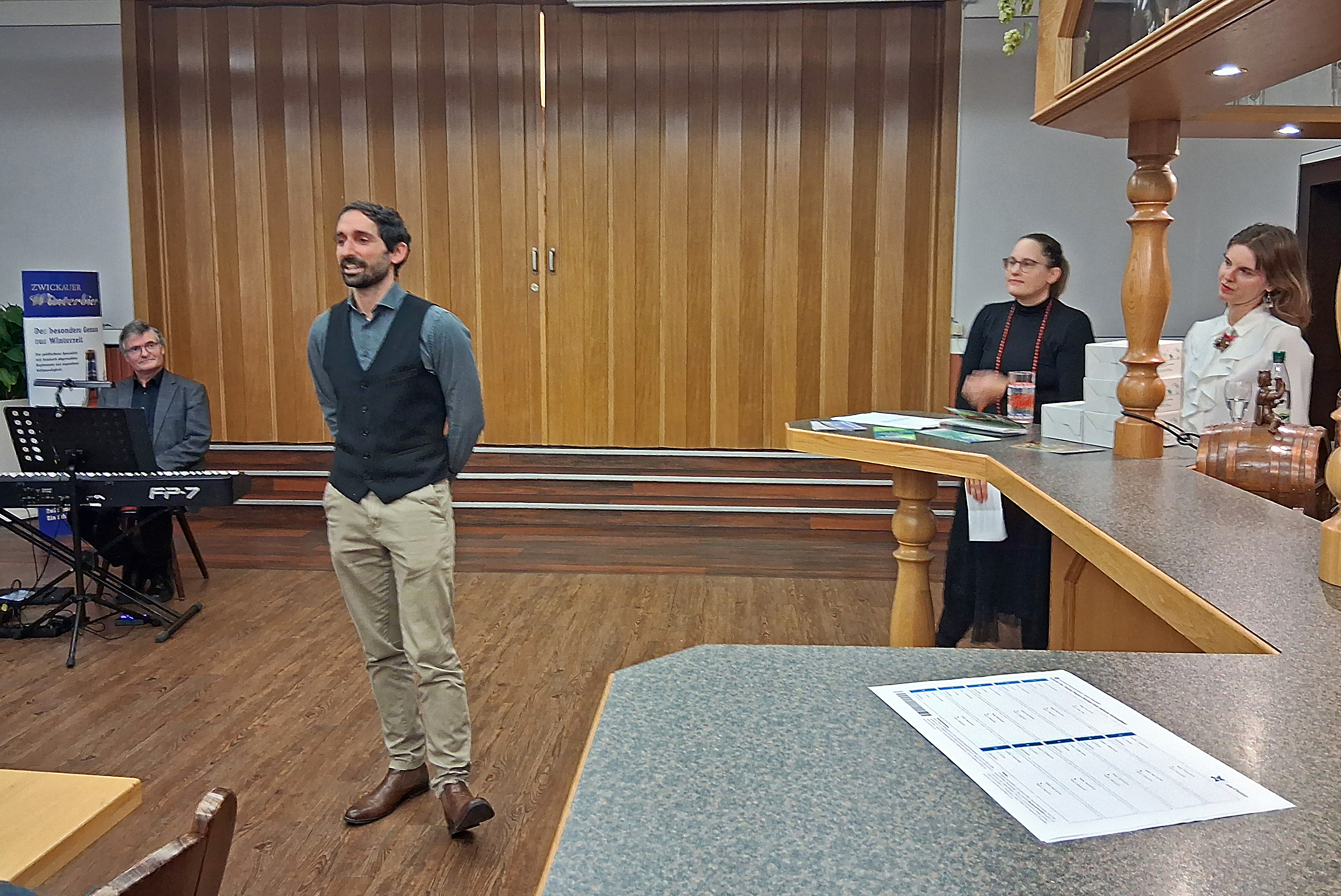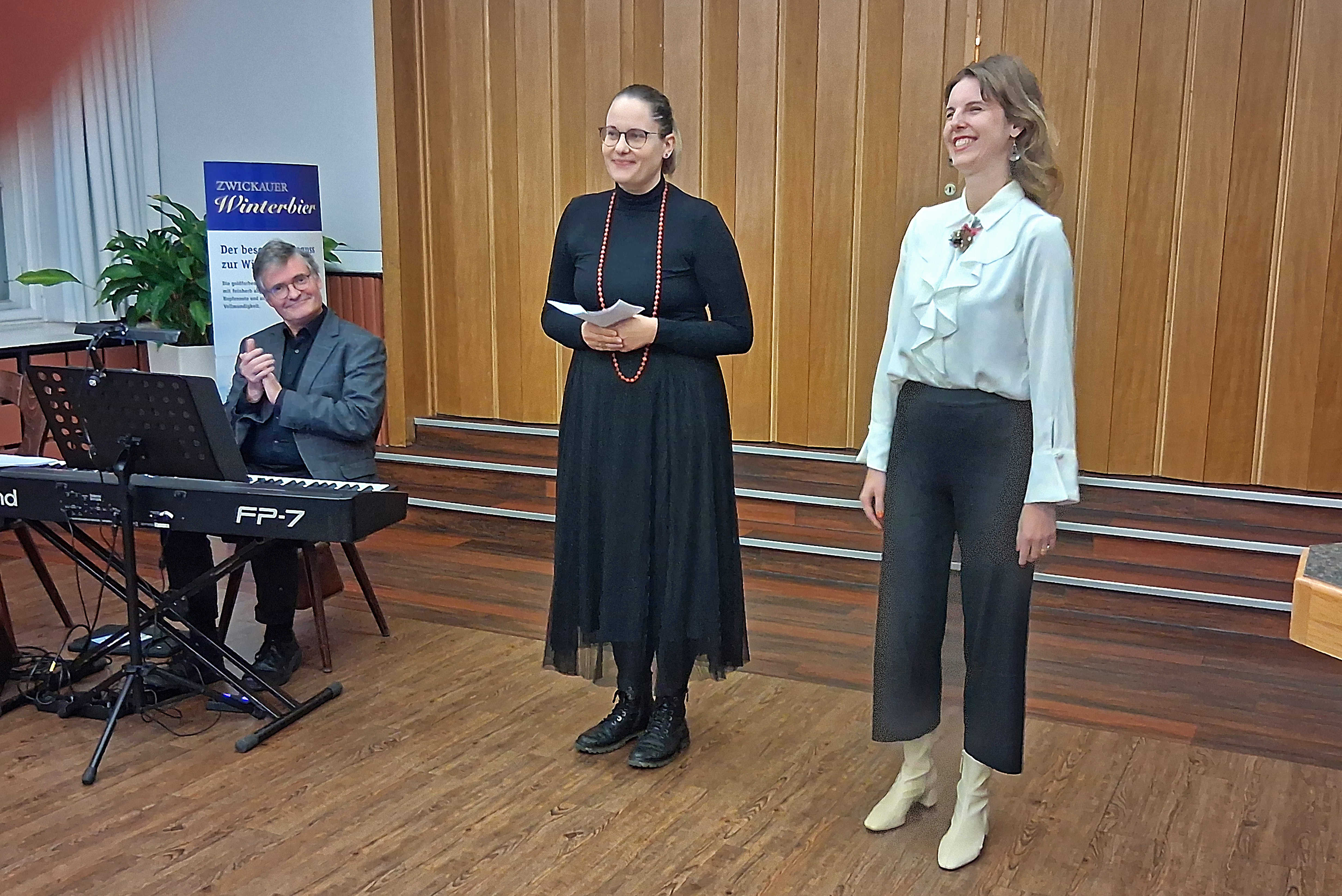 Die Begrüßung unserer Gäste – Anne Sandmann, die junge Mezzosopranistin Joanna Jaworowska und Matthias Spindler – übernahm diesmal Patrick Pühn, der seit diesem Jahr Vorstandsmitglied unseres Fördervereins ist. Für die weihnachtliche Stimmung sorgten verschiedene Lieder und Geschichten, und nebenbei erfuhren wir auch wieder viel Interessantes von den Künstlern. So erzählte uns Joanna „Ascha“ Jaworowska, dass sie über das Erasmus-Programm als Organistin nach Deutschland kam. Aber der direkte Kontakt zum Publikum reizte sie dann doch mehr, und sie studierte Kirchenmusik und Gesang. Ein spannender Werdegang! Als Mezzosopranistin ist sie öfter in Hosenrollen zu sehen, sie genießt diese Möglichkeit, in ganz verschiedene Rollen zu schlüpfen und freut sich besonders auf ihre Rolle in „Hoffmanns Erzählungen“. Dann plauderte sie noch über die Weihnachtsbräuche in Polen, und mit einem polnischen Weihnachtslied endete diese kurzweilige Vorstellung.