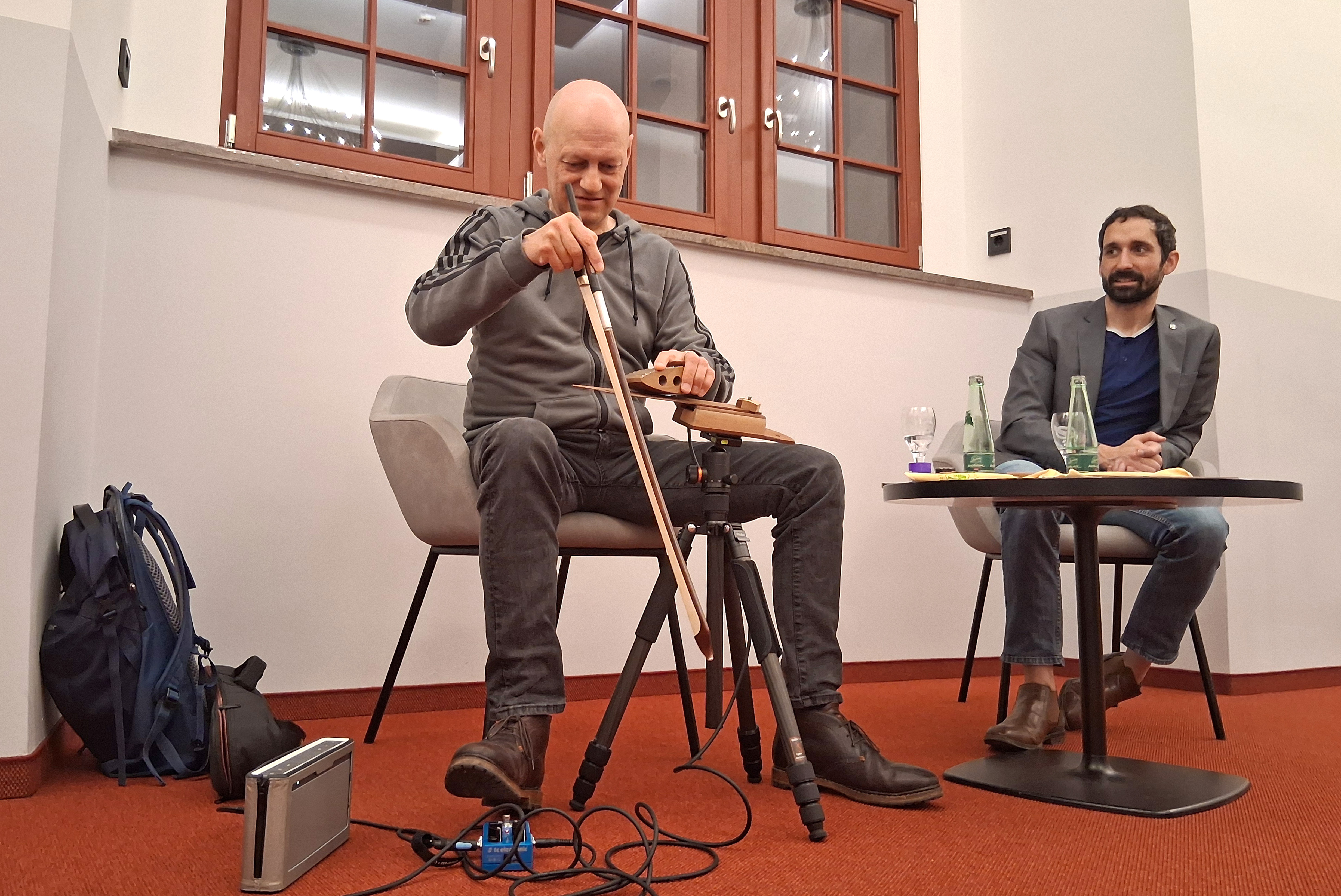 Neben Klavier hat er bereits früh auch Interesse für andere Instrumente gehabt, z. B. Gitarre und Querflöte. Und er ist ständig auf der Suche nach neuen Instrumenten, um Personen und Handlungen auf der Bühne möglichst individuell zeichnen zu können. Bei der Suche nach Musik für „Richard III“ stieß er auf das von dem Wuppertaler Gitarristen Hans Reichel erfundene Daxophon – dem er ganz spannende, surreale Töne entlockt. Gespannt lauschten wir auf die vielen unterschiedlichen Facetten dieses Instruments, bei dem eine Holzzunge zum Schwingen gebracht wird.