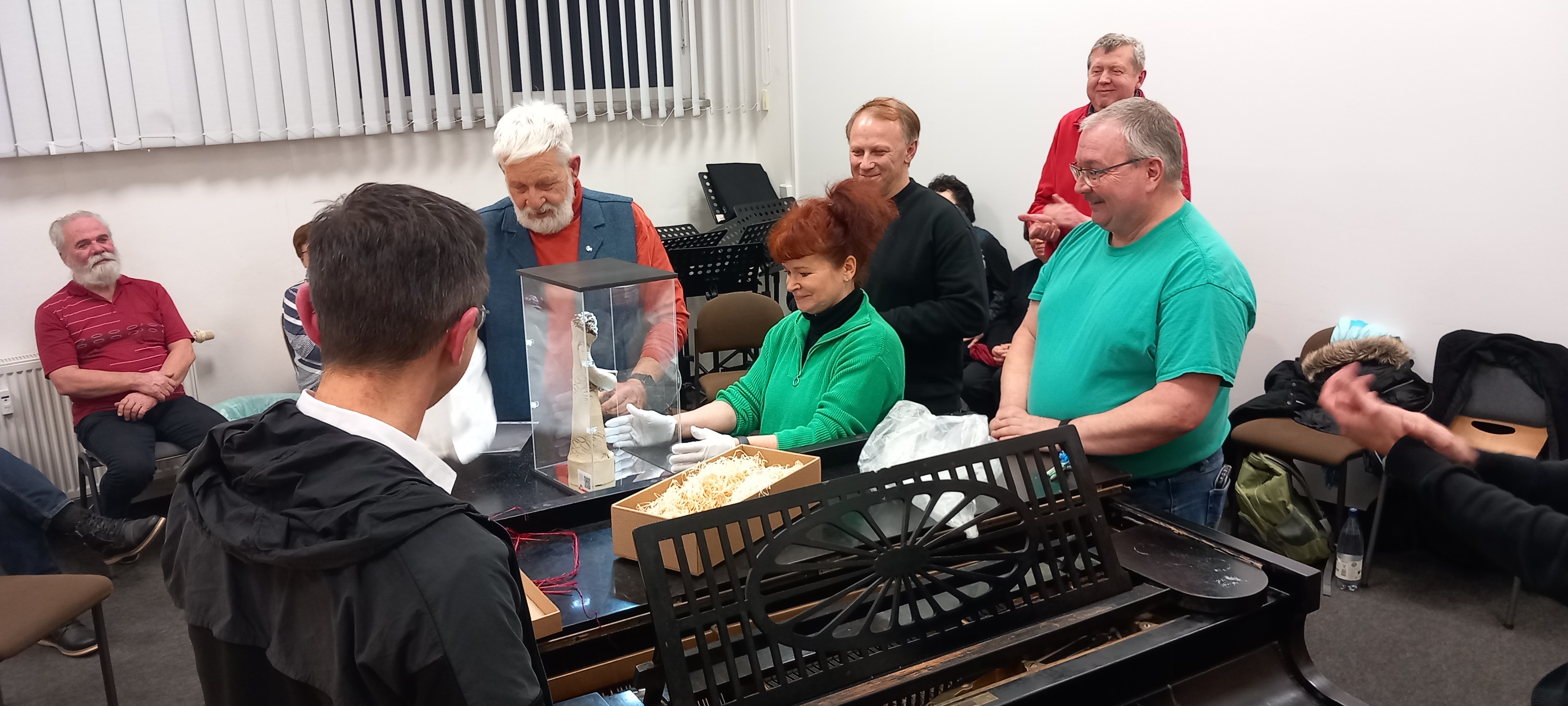 Am Ende des Abends gab es noch ein besonderes Geschenk: Der Opernchor wurde zum Theaterball 2024 als Theaterliebling mit einem „Oscar“ ausgezeichnet, und dafür erhielt er nun vom Theaterförderverein eine beleuchtete Vitrine, die ihren Platz im Chorsaal finden wird und große Freude bereitete.