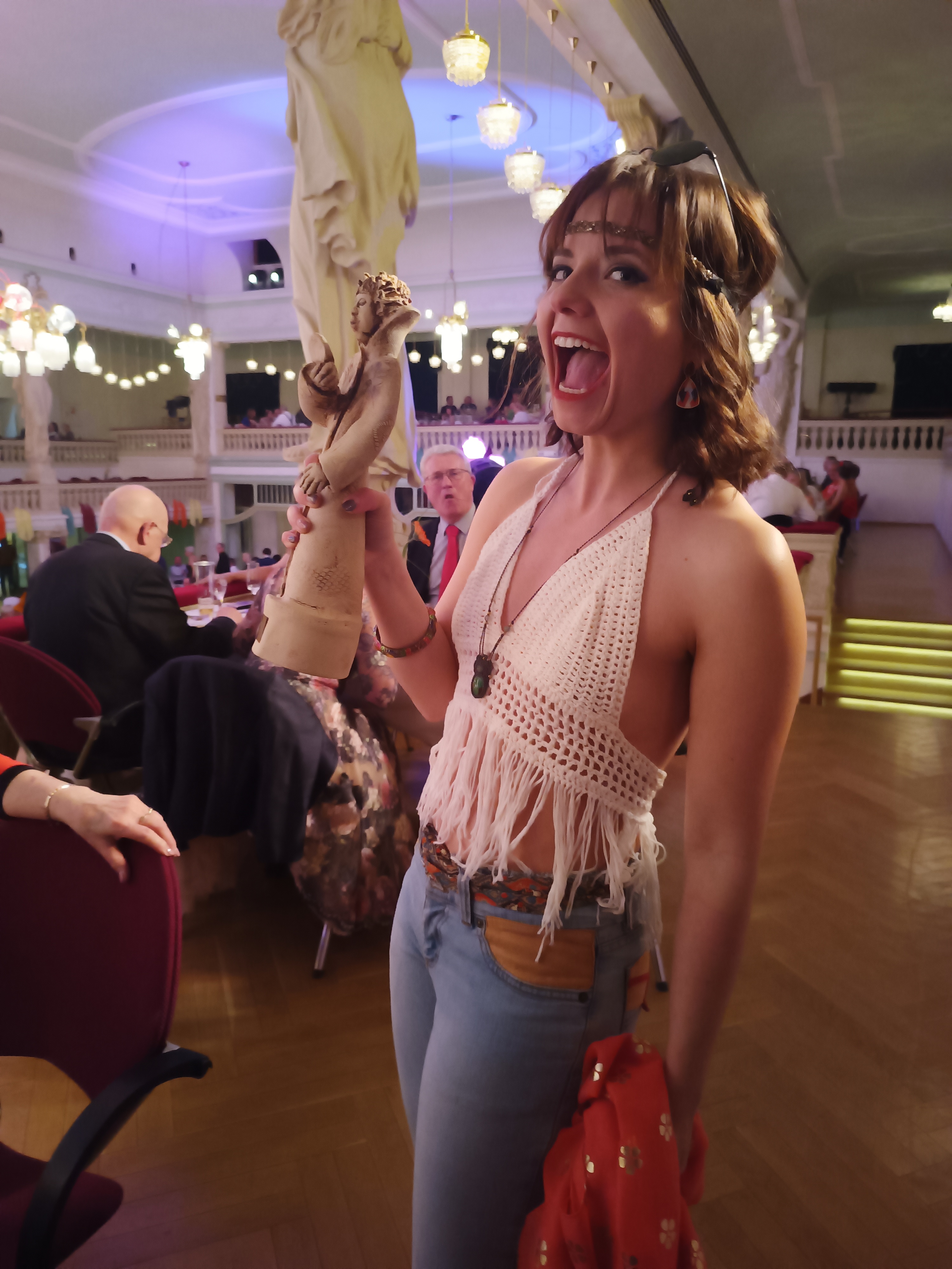 Der Ball war wieder ausgebucht – viele erwartungsfrohe Zuschauer warteten gespannt auf den Beginn. Das Programm führte von „California Dreamin“ über die Beatles, „My Fair Lady“, Tschaikowskys Blumenwalzer, „Das Dschungelbuch“ bis zum gemeinsamen Abschlusssong von den Beatles: „All you need is Love“. Zum Ende des Galaprogramms waren dann Andreas Schlesiger und Knud Müller vom Vorstand unseres Fördervereins mit auf der Bühne. Sie überreichten der völlig überraschten Preisträgerin des diesjährigen Publikumspreises, der Sängerin Elisabeth Birgmeier, den „Oskar“ für die Spielzeit 2024/2025 und einen wunderschönen Blumenstrauß. In seiner Laudatio fand der Operndirektor, Herr Kupich, sehr warme Worte für seine Kollegin. Wir hoffen mit ihm, dass sie möglichst noch lange an unserem Theater bleibt.