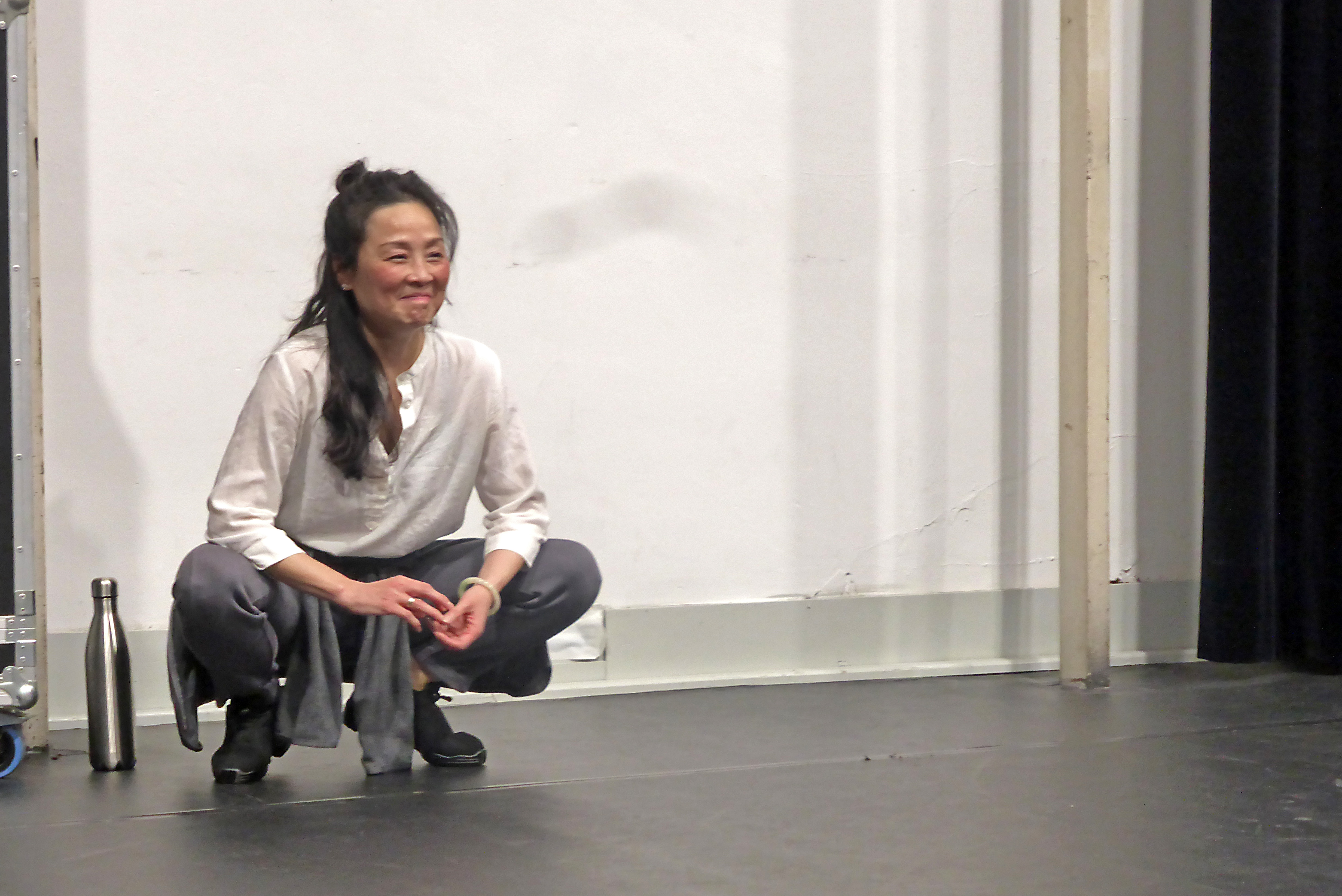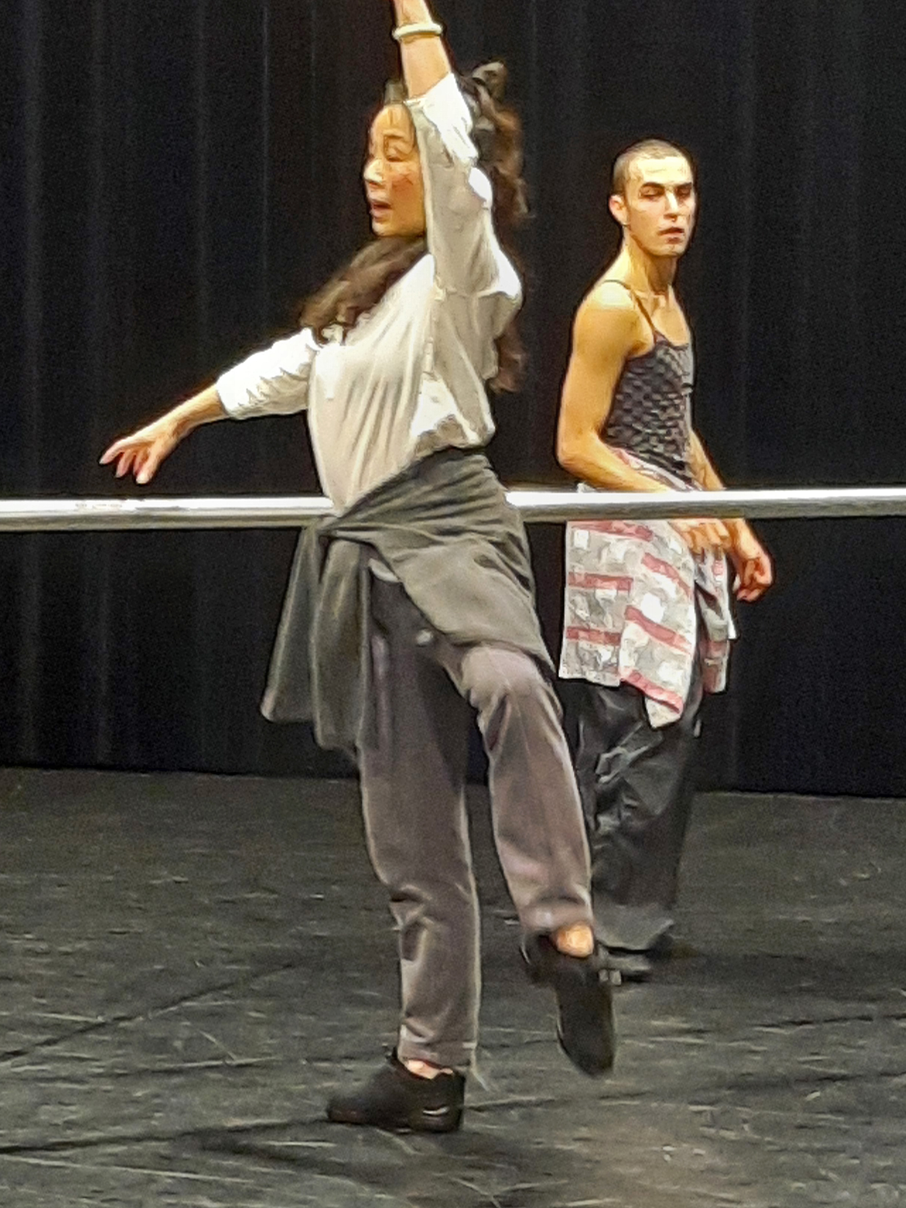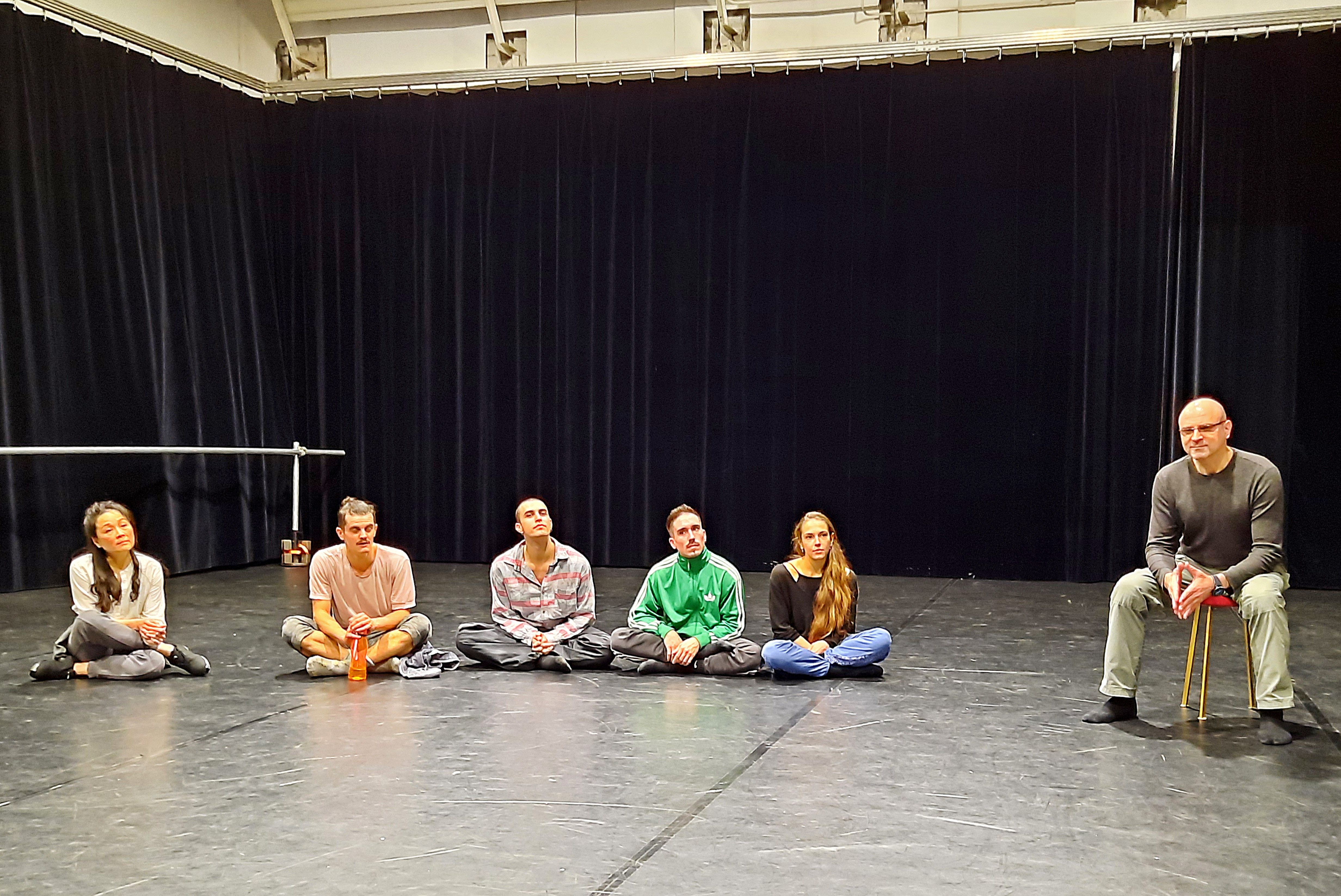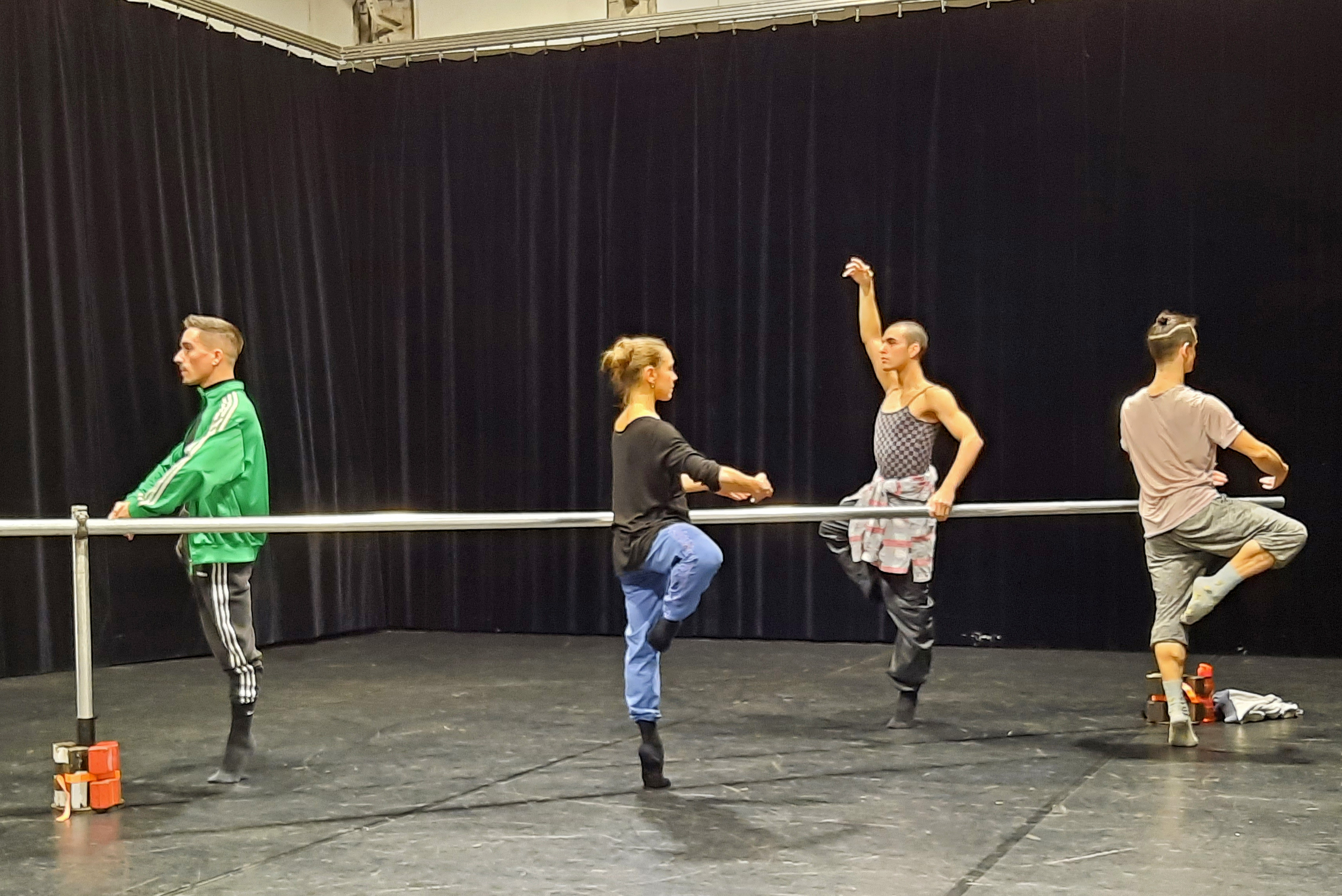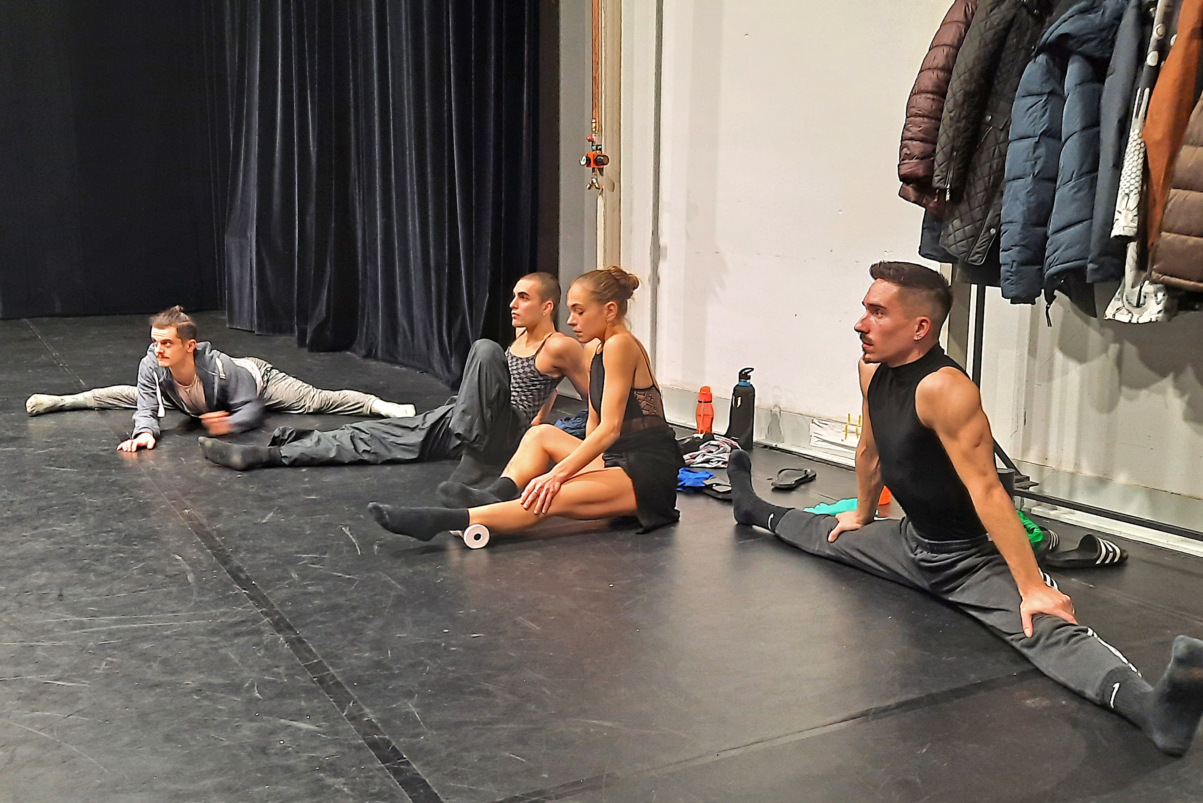 Wir waren zu Gast auf einer Probe des Balletts. Als wir die Probebühne betraten, waren schon vier Tänzer bei der Arbeit. Sie machten sich an der Ballettstange warm, jeder für sich und gemeinsam mit Unterstützung der Assistentin, Ballettmeisterin und Choreografin Wen-Hua Chang sowie des Ballettrepetitors und Pianisten Masayuki Carvalho. Da die Ballett-Compagnie eine ganz internationale Truppe ist, ist die „Amtssprache“ englisch, verziert mit einigen französischen Fachbegriffen. Langsam kamen die Tänzer ins Schwitzen und entledigten sich ihrer Jacken und Überhosen. Immer wieder machten sie zwischendurch Dehnübungen, bei denen schon vom Zuschauen alles weh tut.