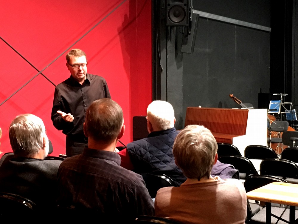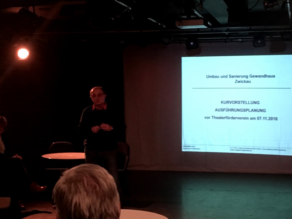 Nach einem interessanten Rundgang in der neuen Ausweichspielstätte „Malsaal“ verfolgten Mitglieder, interessierte Gäste und der Vorstand unseres Fördervereins dann im zweiten Teil unseres Stammtisches am 07.11.2016 aufmerksam die Ausführungen von Herrn Hertrampf (Bauplanungs- & Ingenieurbüro) und Baubürgermeisterin Köhler (Stadt Zwickau) zum Stand und dem weiteren Verlauf der Gewandhaussanierung unseres Theaters.