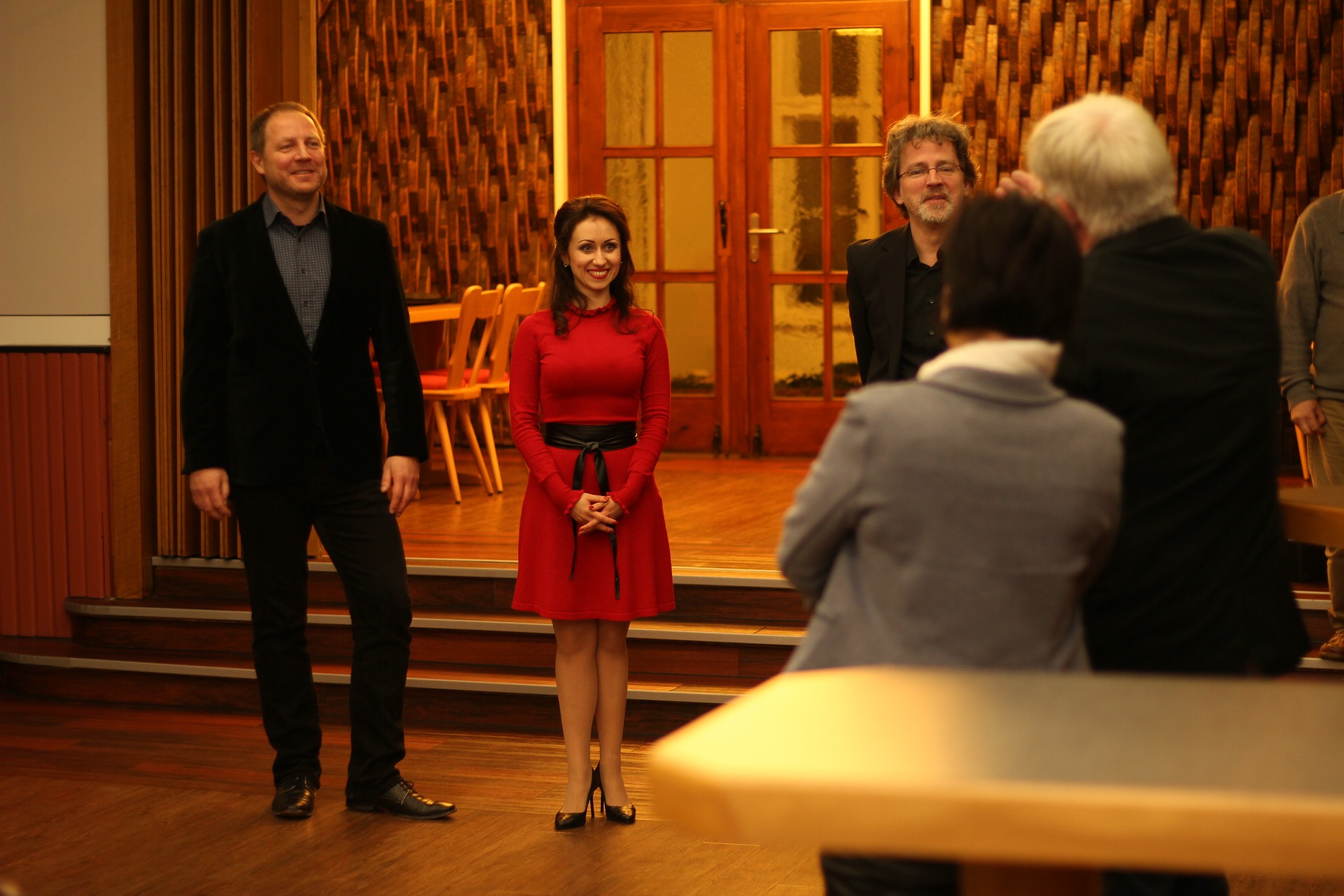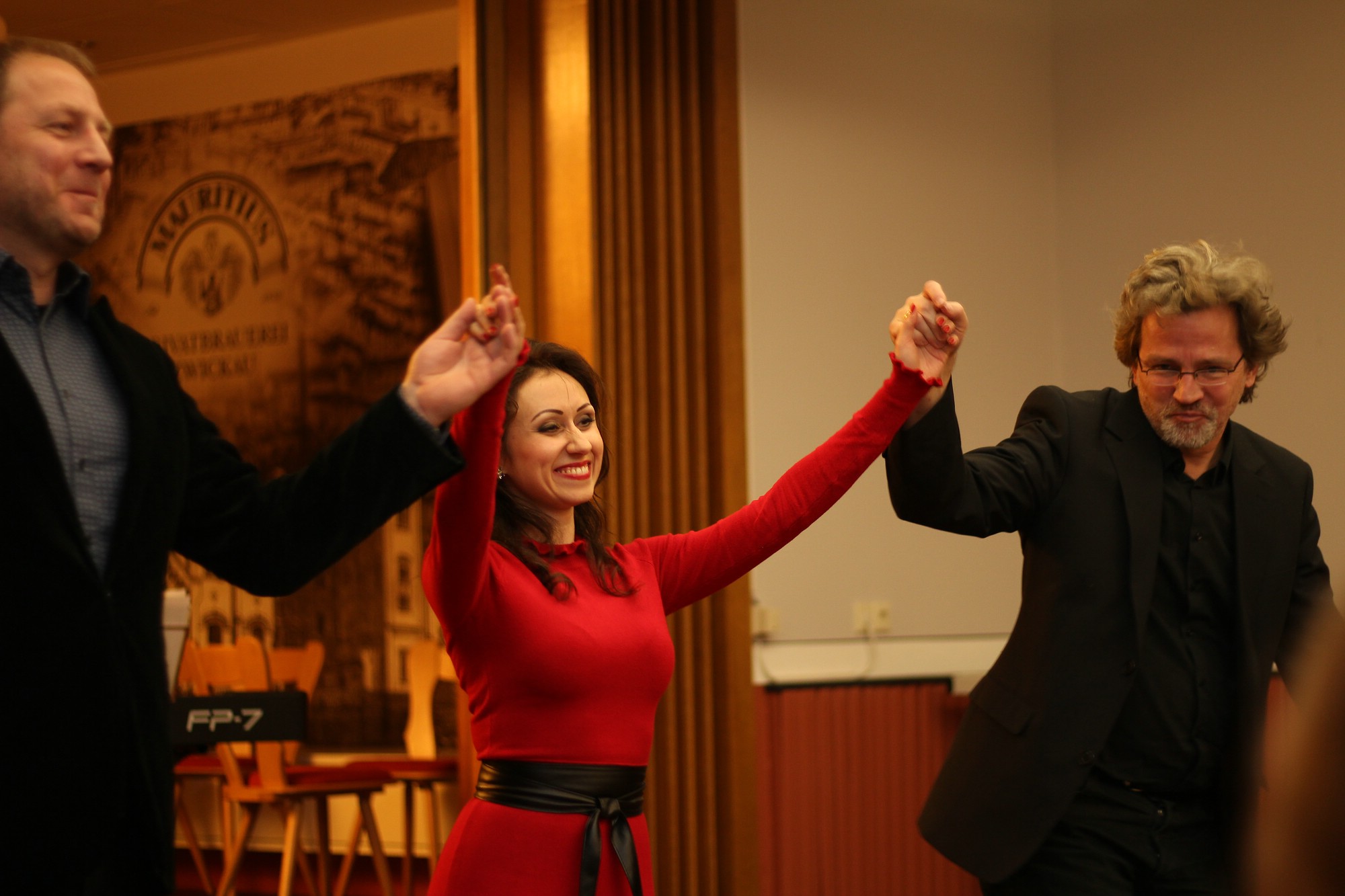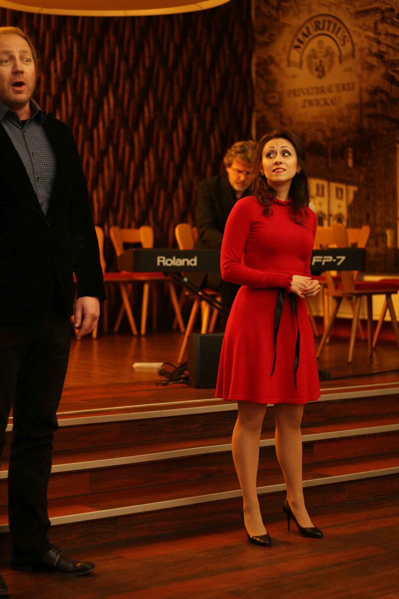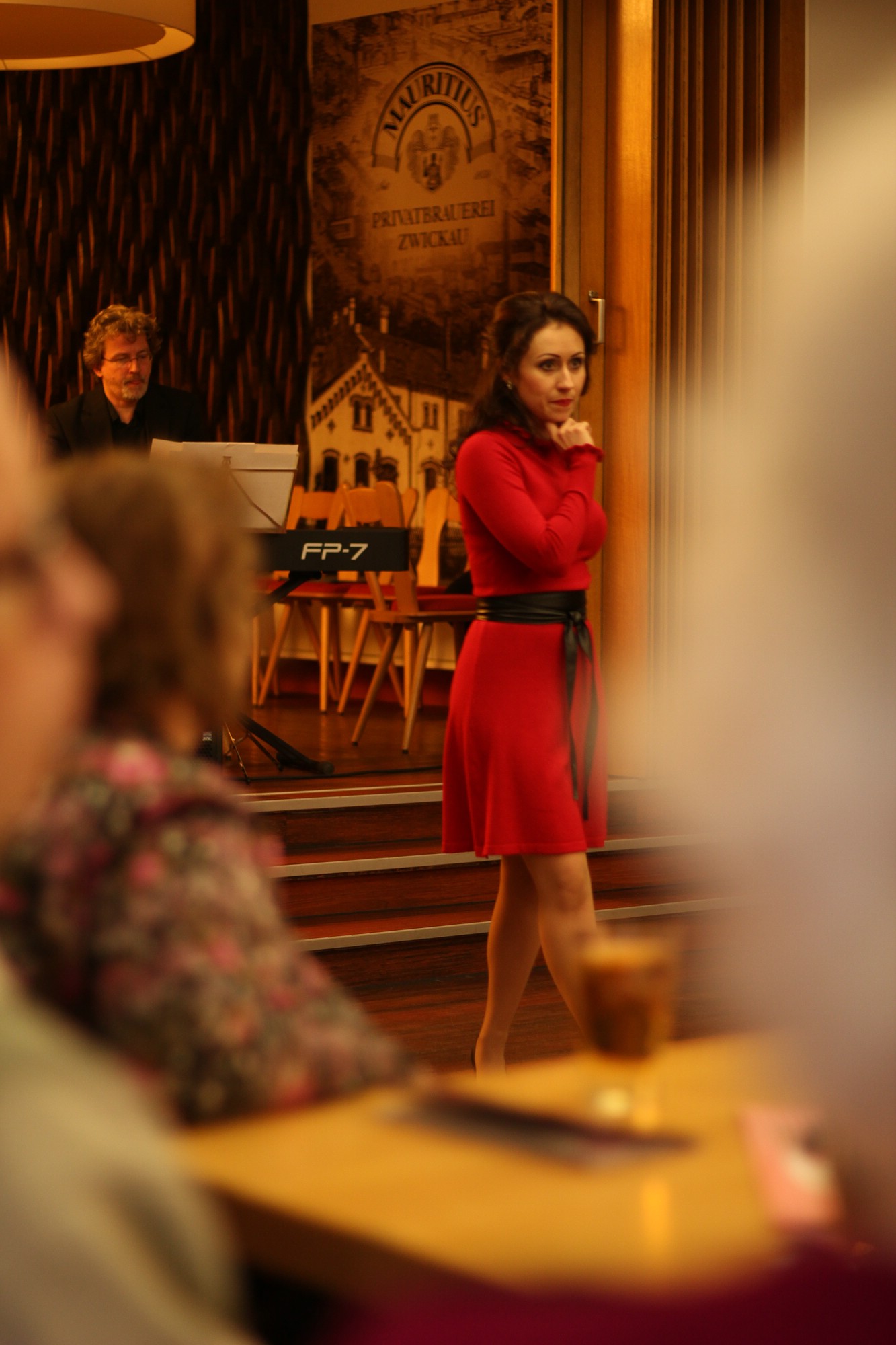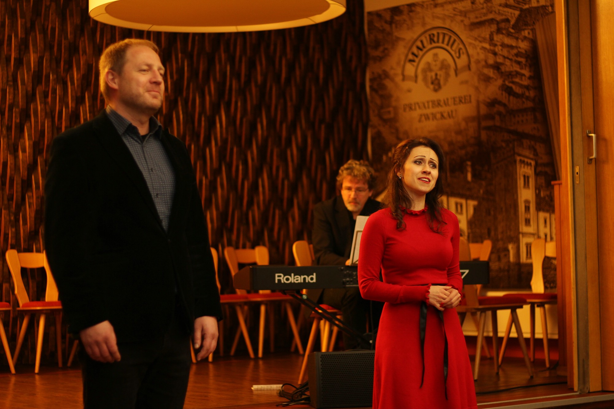 Pünktlich am Vorabend des 04.12.2017 begann es auch noch zu schneien. Die weiße Pracht blieb zwar nicht liegen, trotzdem konnte man die Weihnachtsstimmung spüren. Am Abend des 04.12.2017, um 19:00, Uhr trafen ca. 30 Gäste im Schalander der Mauritiusbrauerei in Zwickau ein. Der Raum war weihnachtlich geschmückt und wenn man eine gute Nase hatte, konnte man den Duft von Räucherkerzchen wahrnehmen. Unser Vorsitzender, Henry Klüglich, begrüßte alle recht herzlich. Und, wie schon zu einer guten Tradition geworden, stimmten uns Künstler unseres Theaters musikalisch auf die Adventszeit ein. Mit den Wünschen auf eine weiße Weihnacht, gemeinsam gesungen von Nataliia Ulasevych und Karsten Schröter, unter musikalische Begleitung von Martin Eckenweber, ging das musikalische Intermezzo zu Ende. Mit viel Applaus und einem kleinen Dankeschön wurden die Künstler verabschiedet. Anschließend lud uns Henry Klüglich an das kalte Buffet ein. Danach war genügen Zeit, um Gespräche zu führen, auch mit Andre‘ Meyer, unserem neuen leitenden Dramaturgen für Musiktheater, Konzert und Ballett. In diesem Jahr war es auch einmal der Leiterin vom Besucherservice, Claudia Kuntze, zeitlich möglich, unseren Stammtisch zu besuchen. Frau Kuntze ist unser „fleißiges Bienchen“, wenn es an die Kuvertierung und Versendung der Einladungen zu den Stammtischen und anderen Veranstaltungen geht. So haben wir ihre Anwesenheit genutzt, um uns bei ihr einmal ganz herzlich für die große Hilfe zu bedanken. Das kam für sie völlig überraschend, umso größer war ihr die Freude anzumerken.