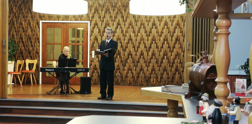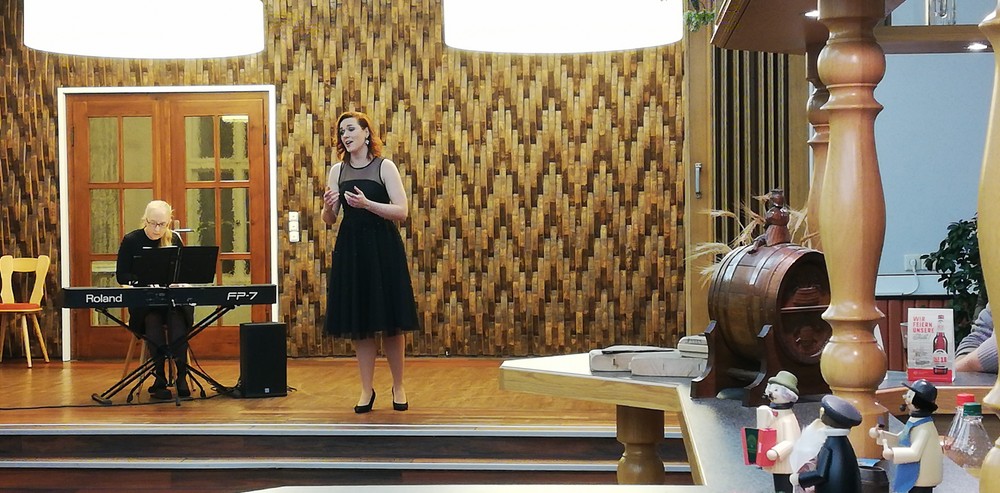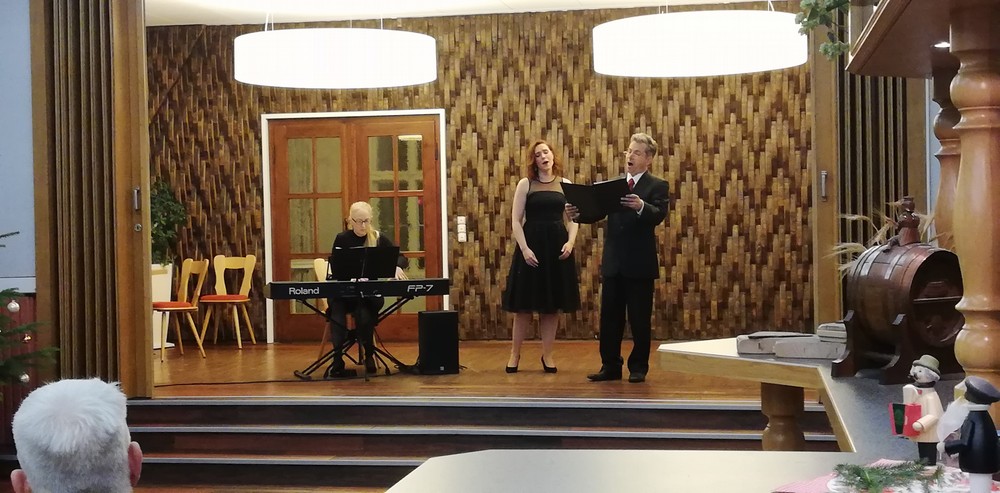 Ein erster Gänsebratenduft erfüllte den Raum, Marcus Sandmann besang eine Weihnachtsgans. Danach konnten wir eine kleine Vorpremiere genießen, Christina Maria Heuel sang das Lied der Mary aus dem Weihnachtsmärchen „Abenteuer im Spielzeugland“, das am 07.12.2019 Premiere in Zwickau hat. Mit dem gemeinsamen Duett „Chants de Noel“(ein Weihnachtslied) verabschiedeten sich die Künstler unter nicht endend wollenden Applaus. Musikalische Begleitung übernahm Kathryn Bolitho. Mit einem kleinen Dankeschön bedankten wir uns. Danach wurde das kalte Buffet eröffnet. Der Einladung zum Buffet und zum Gespräch kamen auch die Künstler gern nach. Das hat alle sehr gefreut.