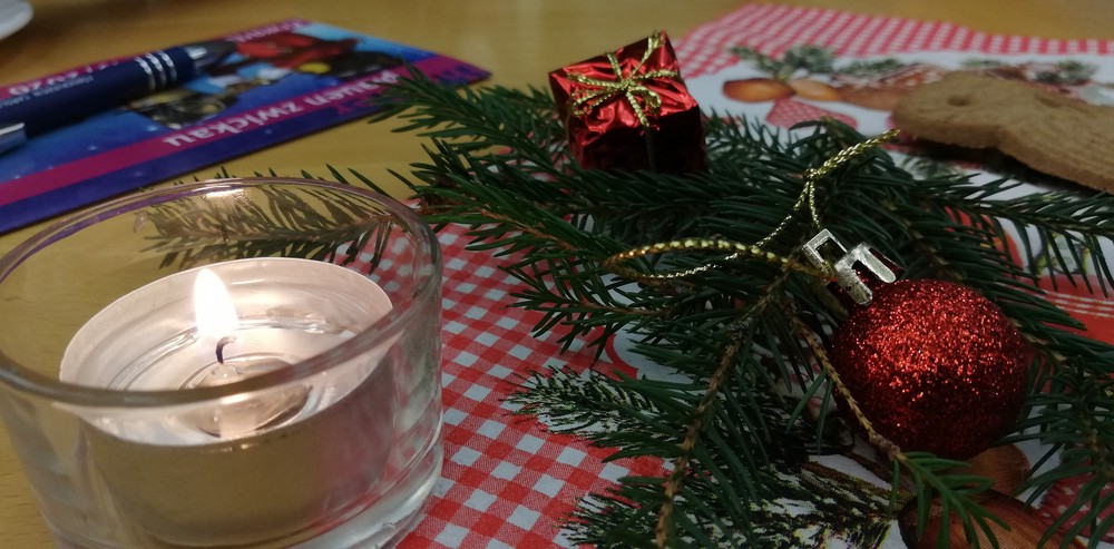 Man brauchte nur dem Räucherkerzchenduft folgen und schon fand man sich in einem weihnachtlich geschmückten Raum wieder. Sogar ein Weihnachtsbaum erstrahlte im Lichterglanz.
